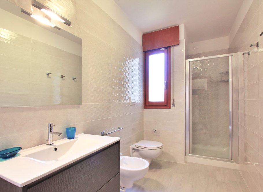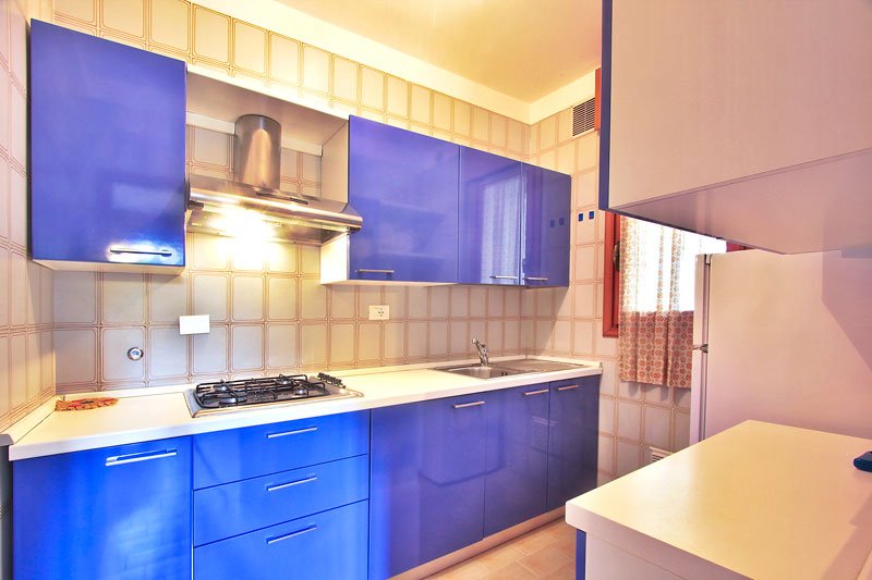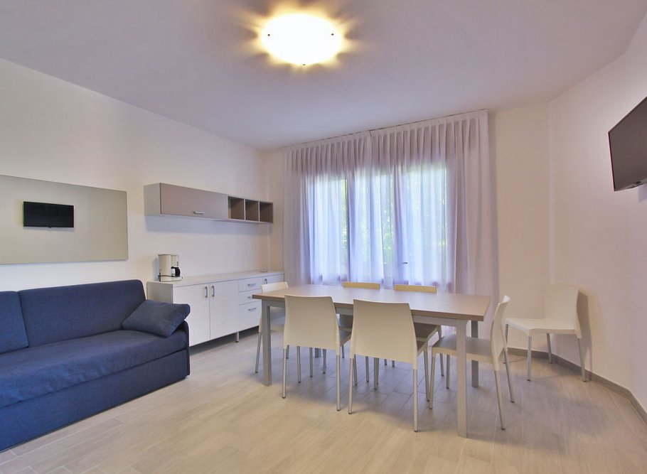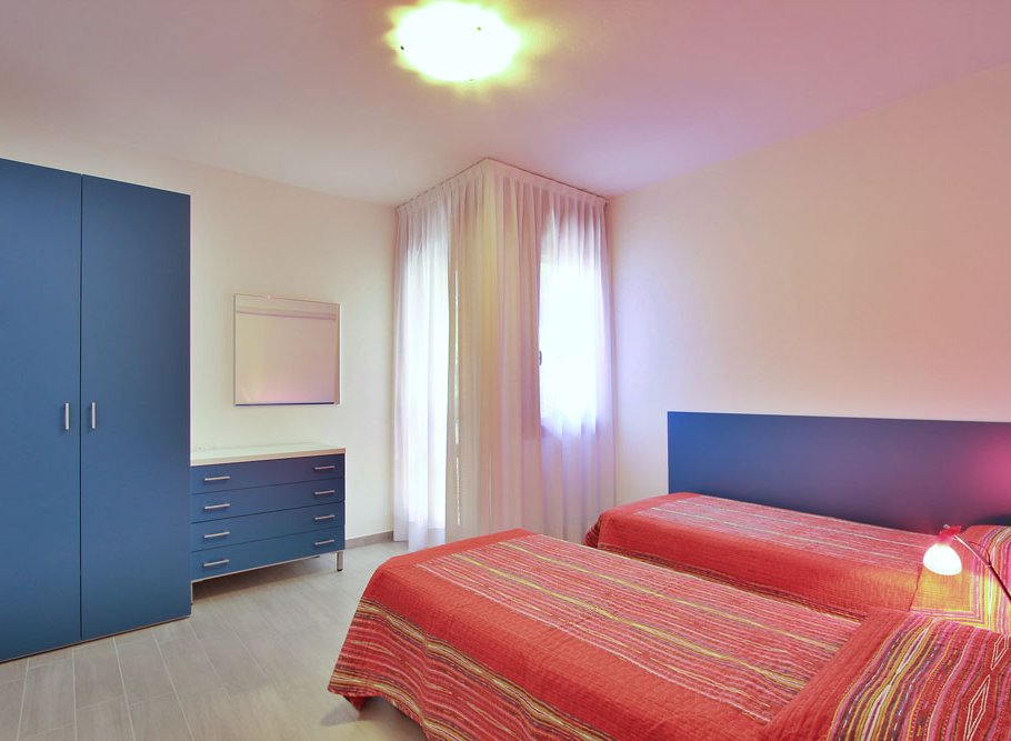 Apartments in the first and second floor: living room with sofa bed, balcony, kitchenette, 1 double room + extra bed, 1 bedroom with 2-3 single beds, bathroom with shower, parking (5/7 beds). Washing machine in common.