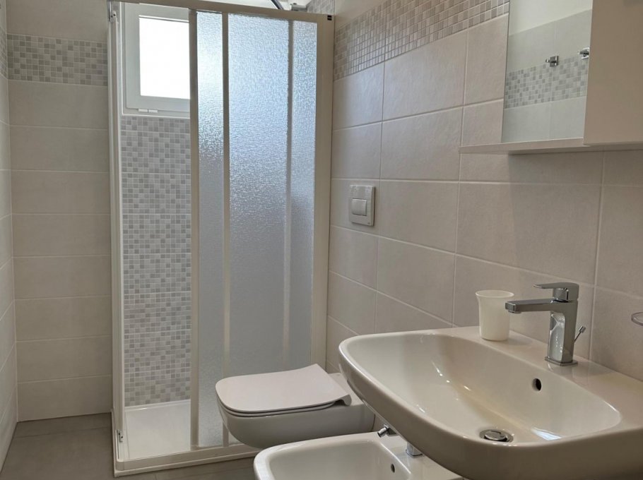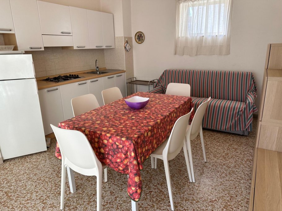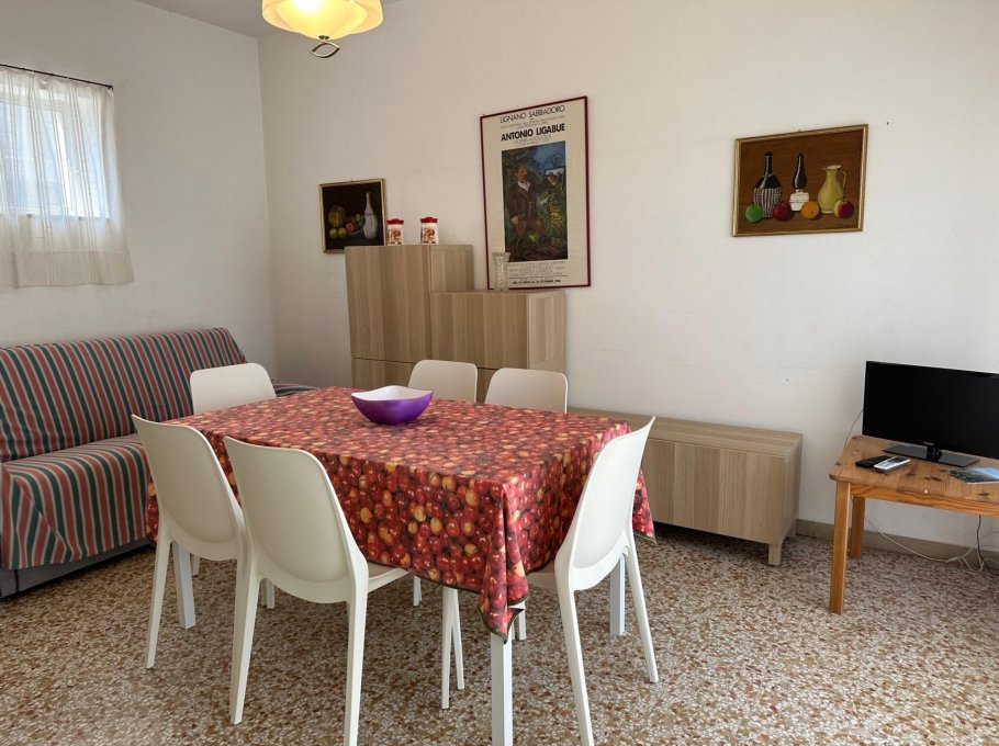 Roomy apartment on the first floor (there is only this apartment on the floor), composed by a large bedroom with double bed and single bed, bedroom with two single beds, single bedroom, living room with sofa and kitchenette, renewed bathroom with box shower and window, spacious terrace; it is also equipped with air conditioning, washing machine,TV and double numbered parking space.
