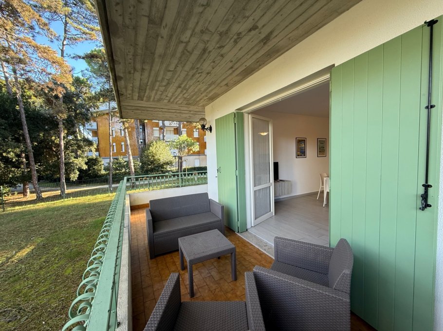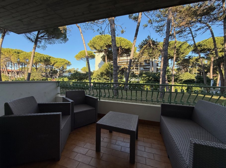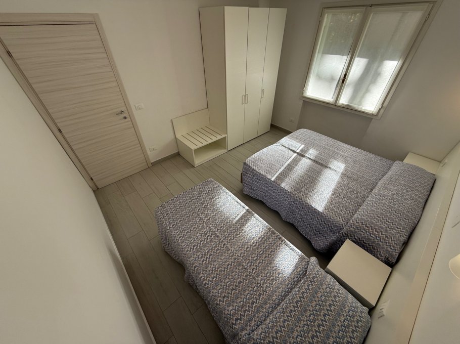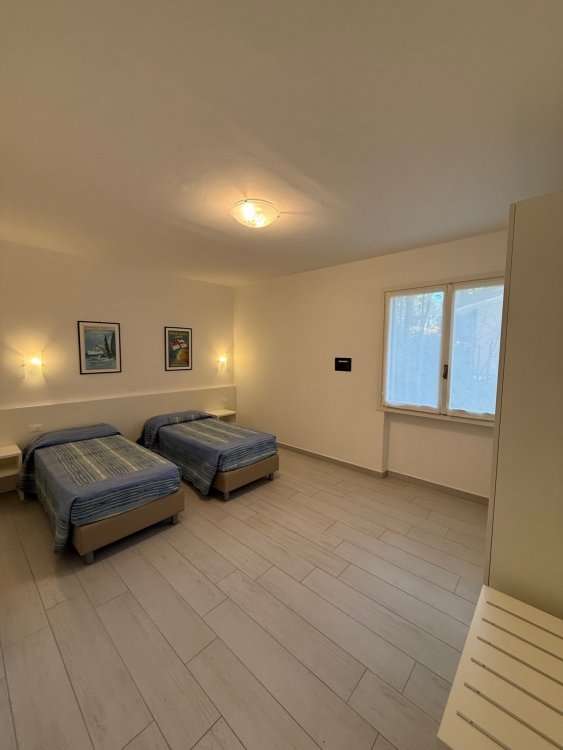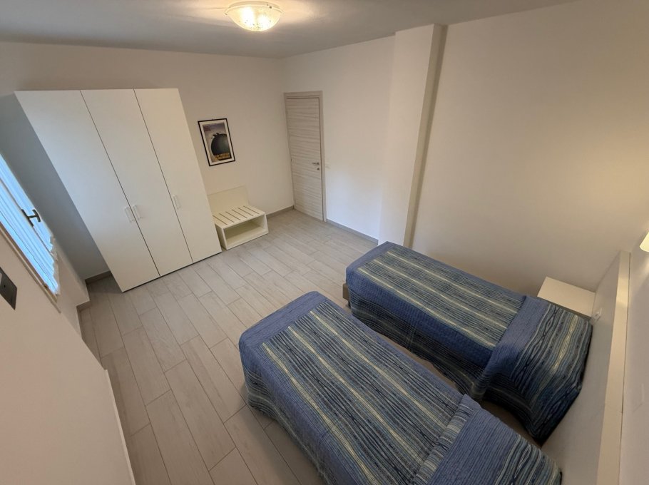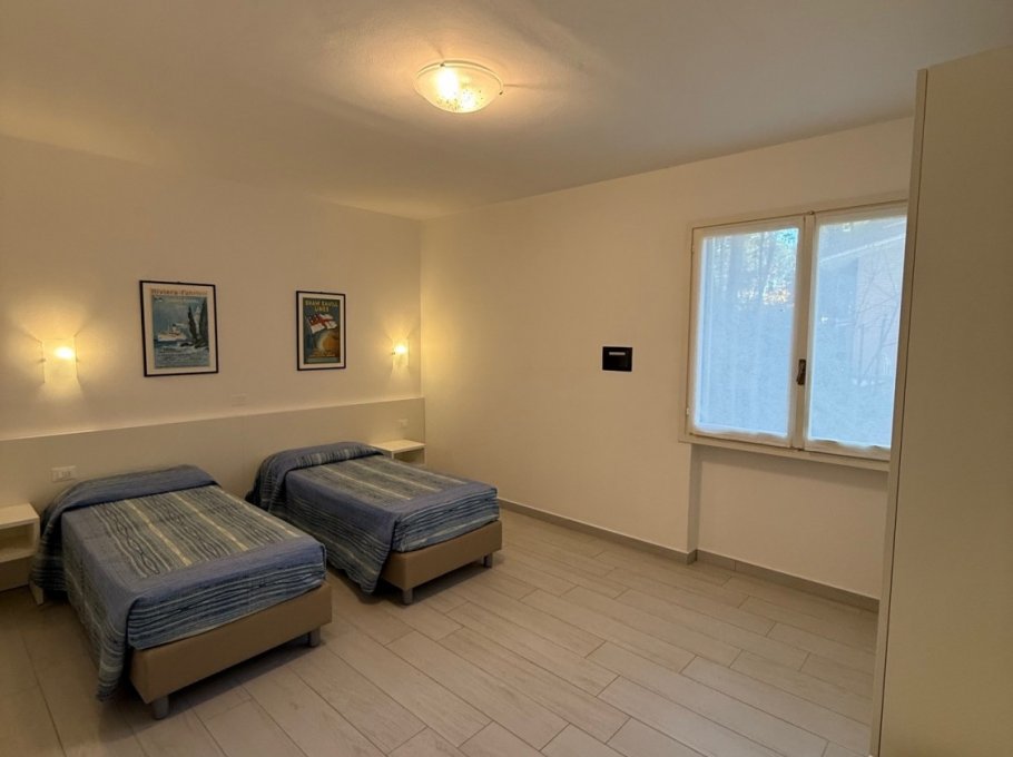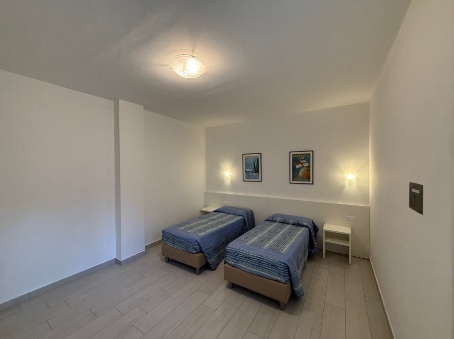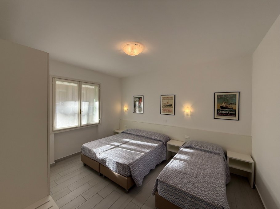 Apartment no. 10A on the mezzanine floor consists of: living room with sofa and direct access to a comfortable terrace equipped with table and chairs, open kitchen with access to another terrace, 1 double bedroom plus single bed, 1 bedroom with 2 single beds, bathroom with window and shower. Large garden. Possibility of adding 2 extra beds in the bedrooms (sleeps 5/7).