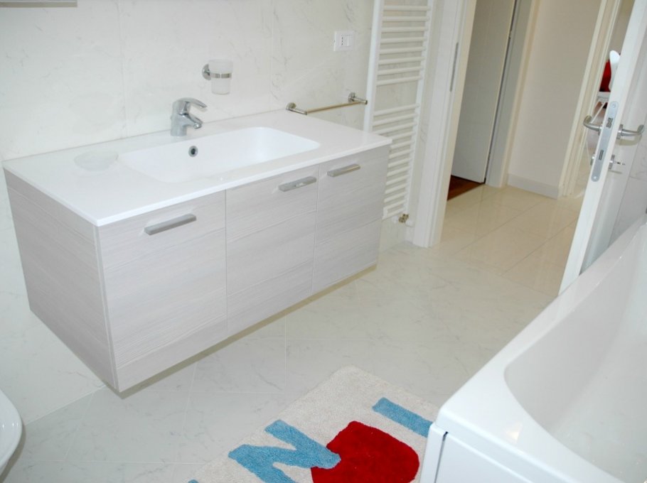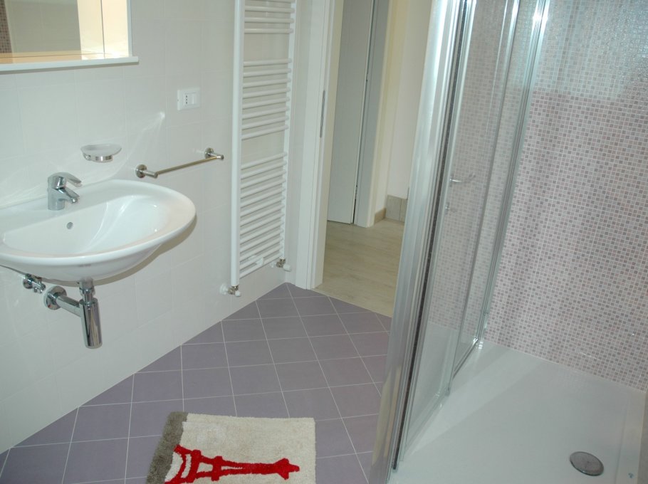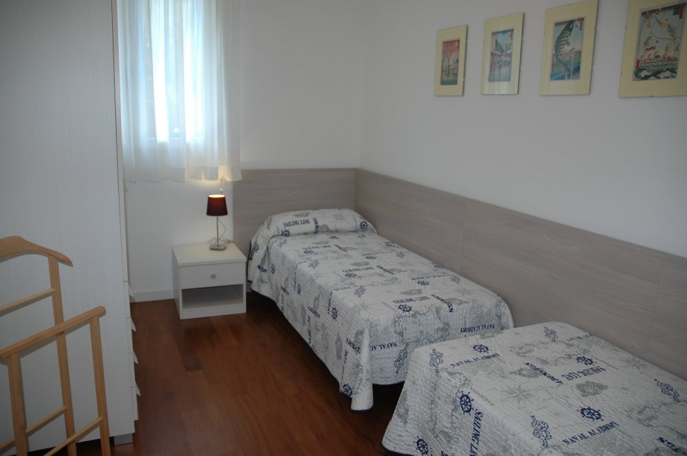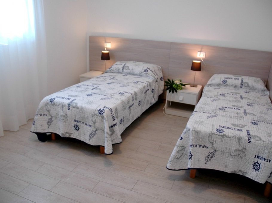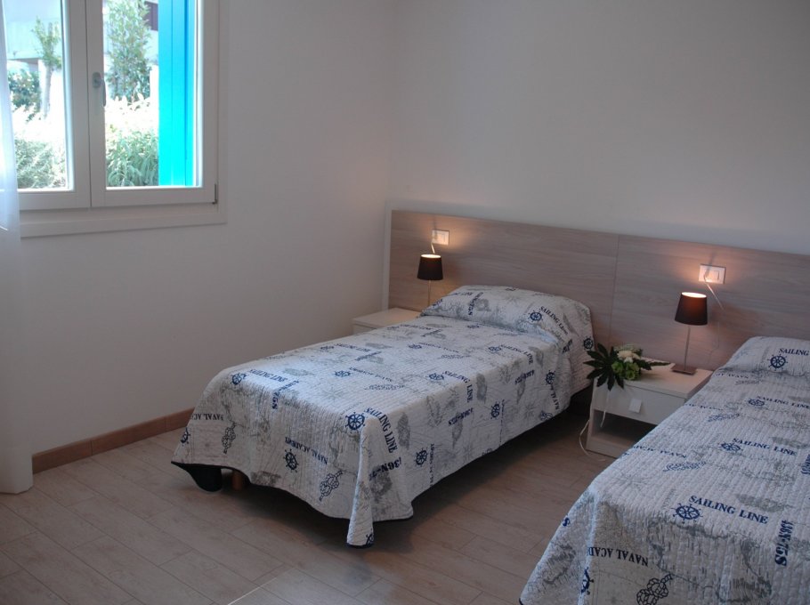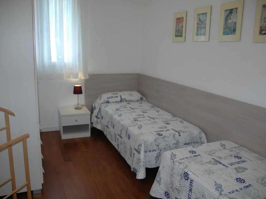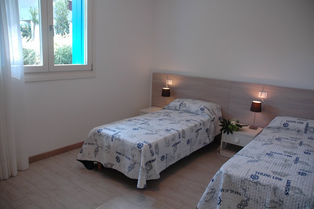 Type E1: on the upper floor spacious and luminous living/dining room with open space kitchen, 1 bathroom with shower/WC, 1 double bedroom, 1 bedroom with 2 single beds, terrace; on the ground floor 2 light and friendly bedrooms each with 2 single beds, 1 bathroom with shower/WC, big terrace, garage and laundry. Flat roof with solarium. For 8 people. Air conditioning unit – heating. Beach service from sunday to friday (1 sun umbrella, 1 sun chair and 1 sun bed) provided on request and subject to availability. Stays from Sunday to Sunday. Energy class B (90.52 kWh/sq m year). CIN: IT030049C2YF4GUTF4