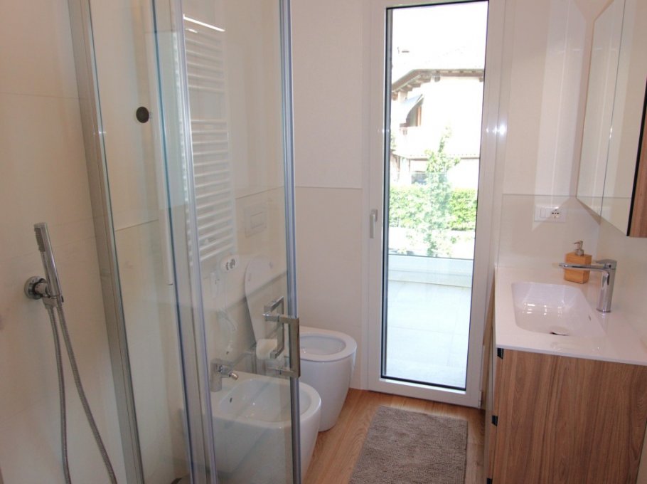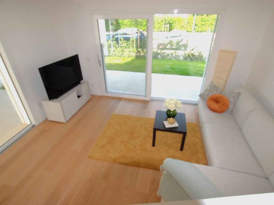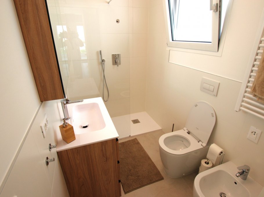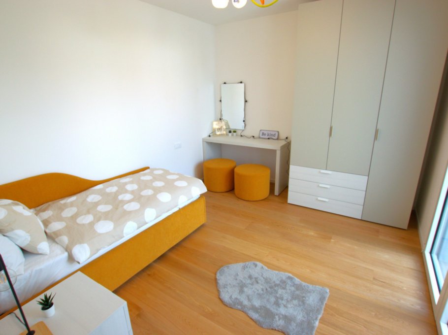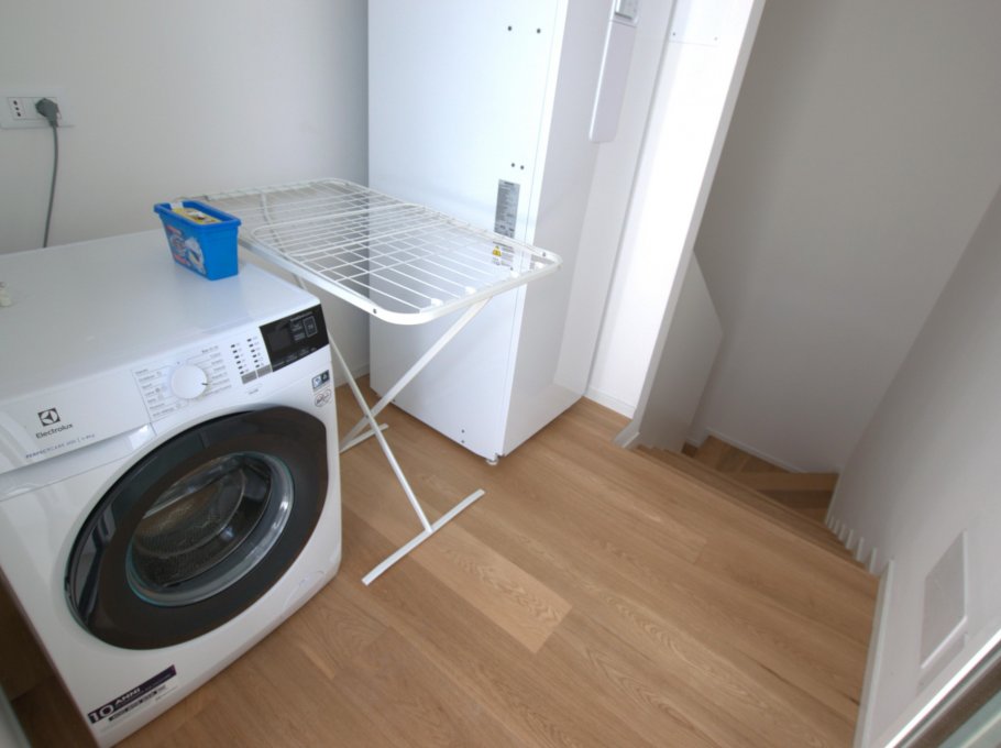 The villa is located on 2 levels. The ground floor consists of: living room with large window overlooking a private garden, small service bathroom, separate kitchen with all necessary appliances. Upstairs there is a double bedroom with walk-in closet, two single rooms with a second pull-out bed, 2 bathrooms with a shower box. Each room has access to a terrace. Solarium on the second floor equipped with umbrella and sun beds. The villa has air conditioning, Wi-Fi, satellite TV, underfloor heating and parking.
