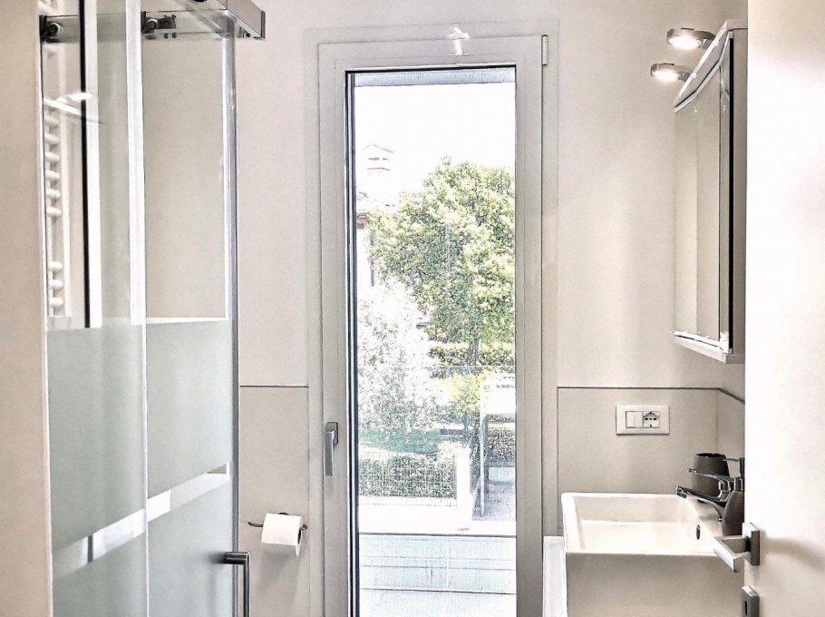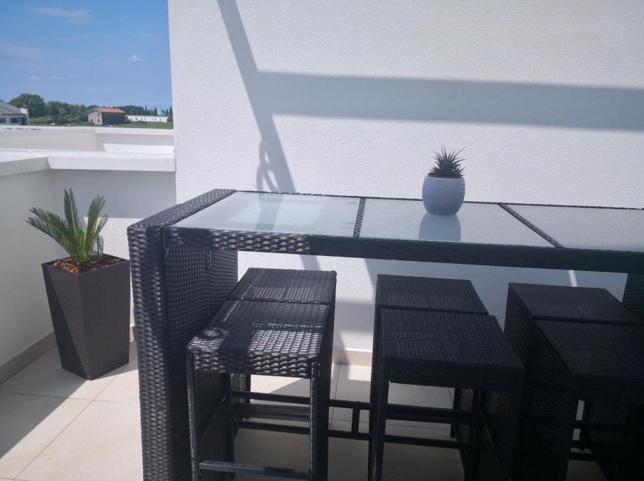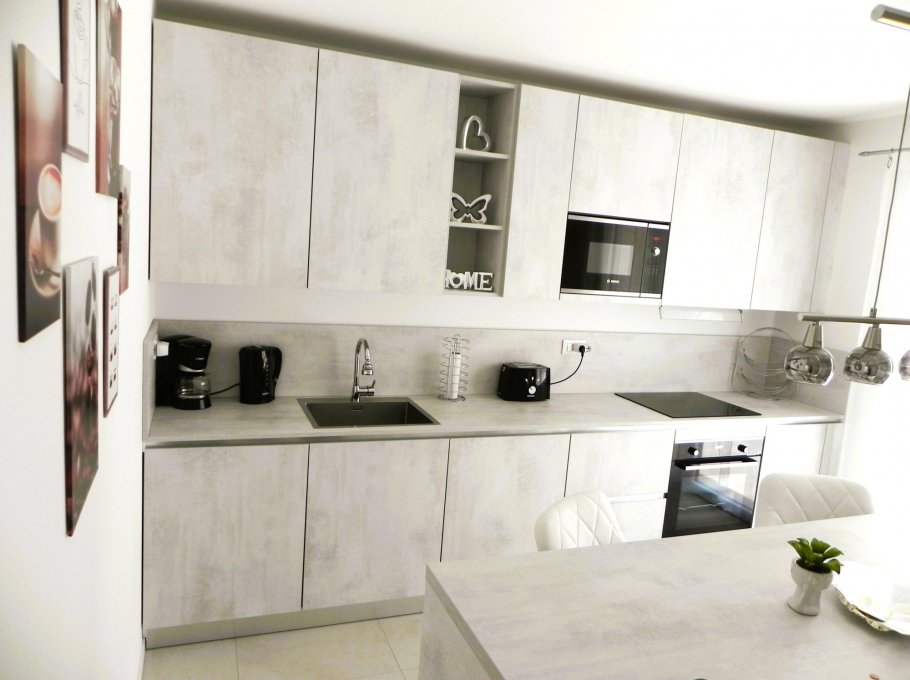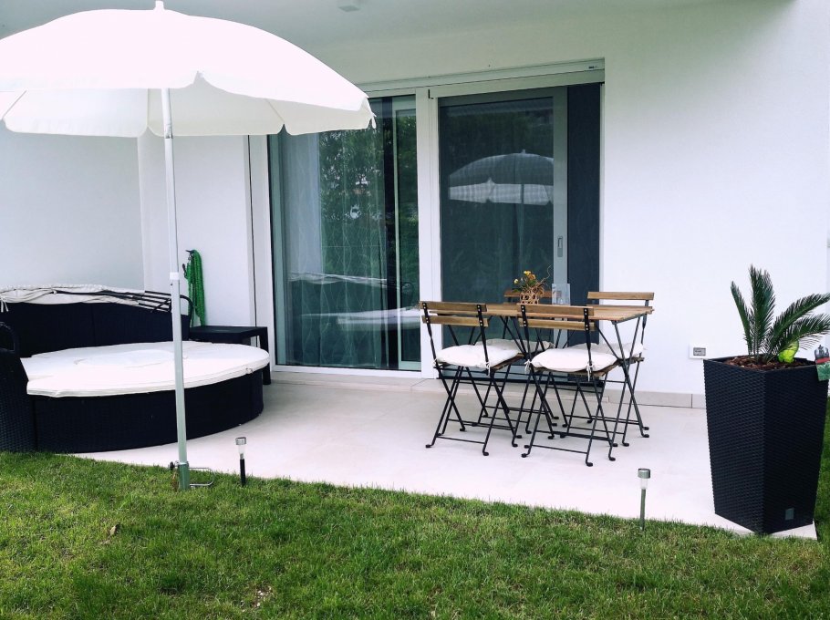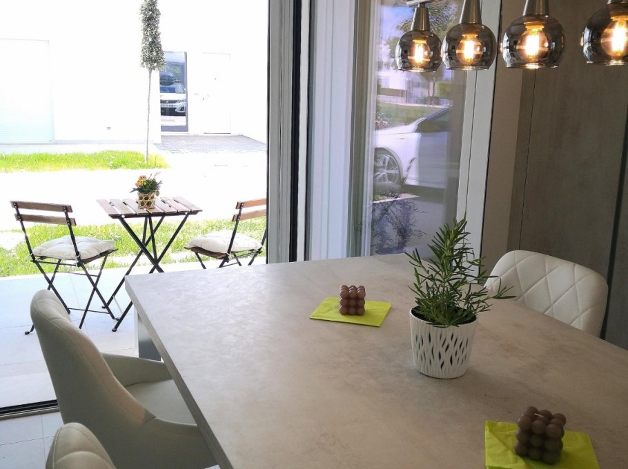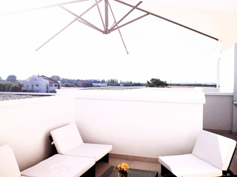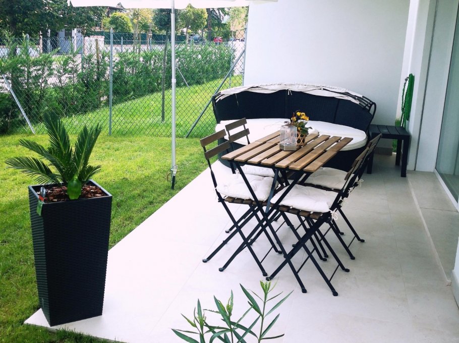 The villa is located on 2 levels. The ground floor consists of: living room with sofa-bed and large window overlooking a private garden, small service bathroom, separate kitchen with all necessary appliances. Upstairs there is 2 double bedrooms and 1 bathroom with a shower box. Each room has access to a terrace. Solarium on the second floor equipped with whirlpool, umbrella and sun beds. The villa has air conditioning, Wi-Fi, satellite TV, underfloor heating and parking.