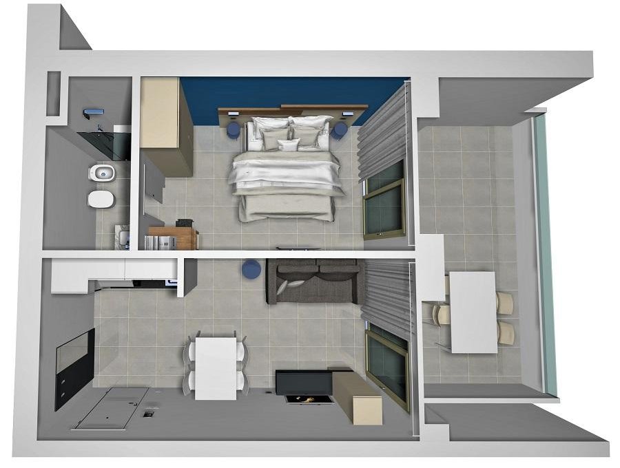 The two-room apartments, which boast the beauty of 35 square meters, are composed of a living area with a fully equipped kitchenette, a dining table and a double sofa bed, a double bedroom, a bathroom with shower box and a large terrace of 22 square meters, furnished with outdoor furniture for dining. Max 4 pax.