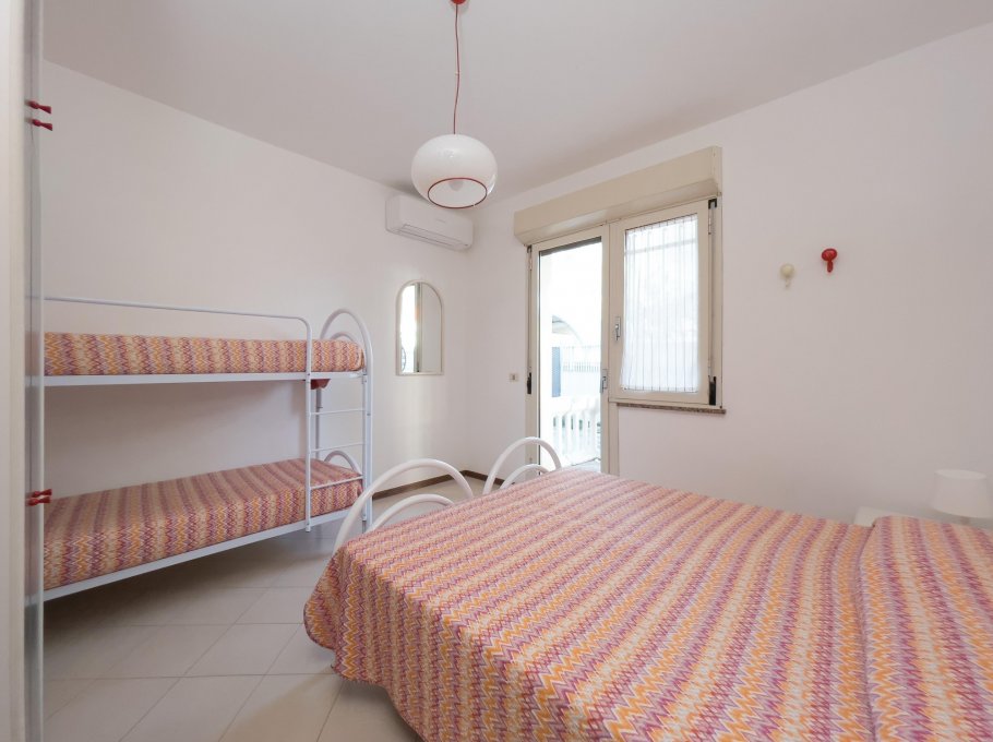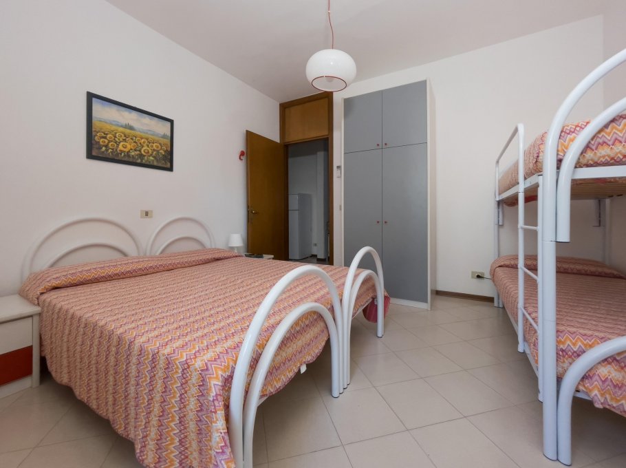 Type E5. Living-bed-room with kitchenette and single-sofa-bed, four-bedded-room (double bed and bunk bed), shower/wc, terrace or balcony with outdoor furniture. Max 5 Pax.