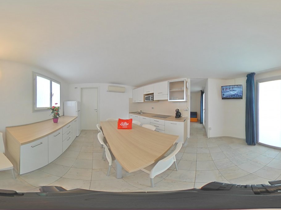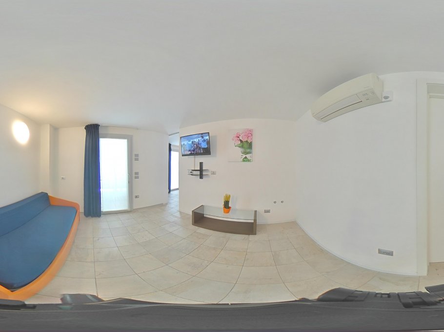 High quality accomodation is provided in these modern apartments consisting of living/dining room with double sofa-bed and kitchenette, tv and microwave, 1 double bedded room, 1 three bedded room, 2 shower box/bidet/wc and a wide furnished terrace. 2 numbered parking places. Air conditioning, wi-fi and final cleaning are included in the price. In the rental rules of the agency are mentioned all the above written service’s ways.