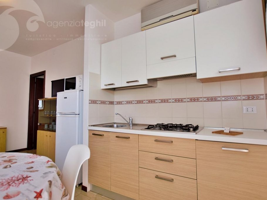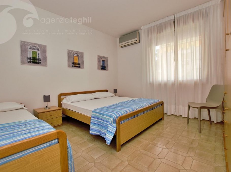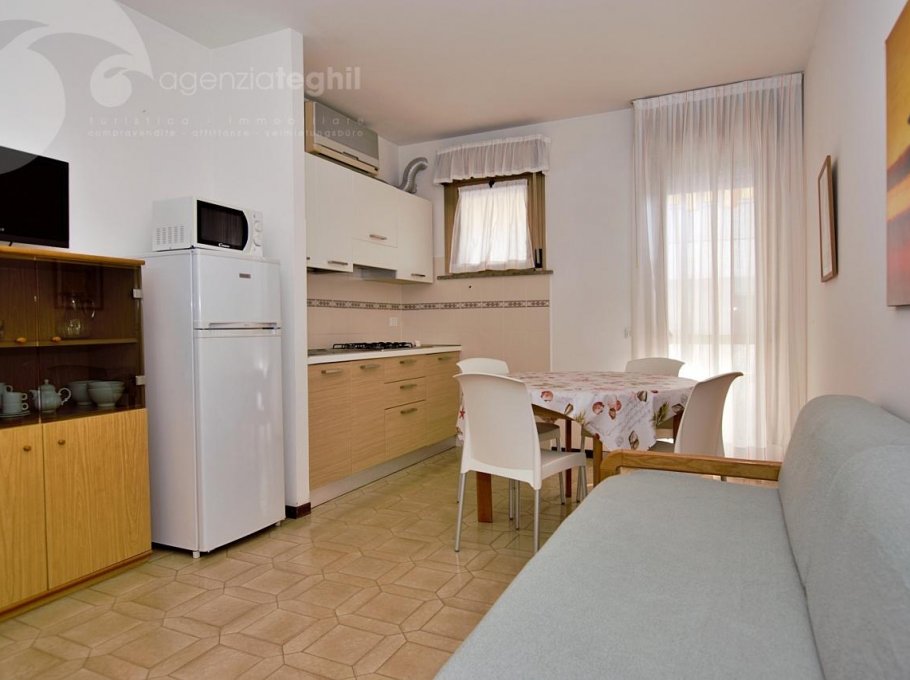Type B - 3/5 persons - Apartment on the 1st floor (no elevator), composed of a bedroom with three beds, windowed bathroom with shower box, living room with sofa bed, television with satellite connection, a kitchenette with refrigerator from 240 lt (separate freezer) and microwave. Terrace with table and chairs.