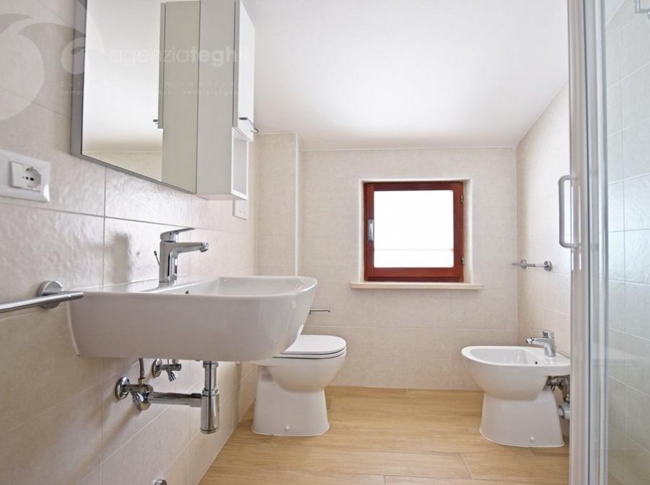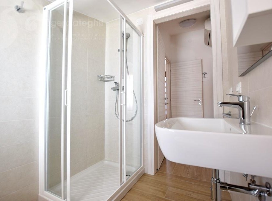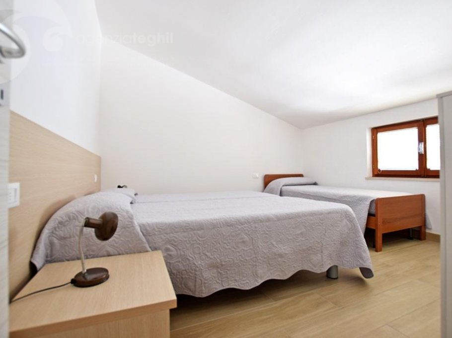 Type C: 5/6 people - Apartment completely renovated with modern finishes, on the 2nd floor (without elevator), composed of a sleeping area with a bedroom with double bed, a bedroom with 3 single beds, bathroom with window and shower cubicle; living area with a living room equipped with a single sofa bed and a television with satellite connection, a kitchenette with a 240-liter fridge (separate freezer) and washing machine, balcony in common with the apartment next door equipped with outdoor table and chairs and awning. The apartment is also air-conditioned and with free Wi-Fi (code to be requested in the agency).