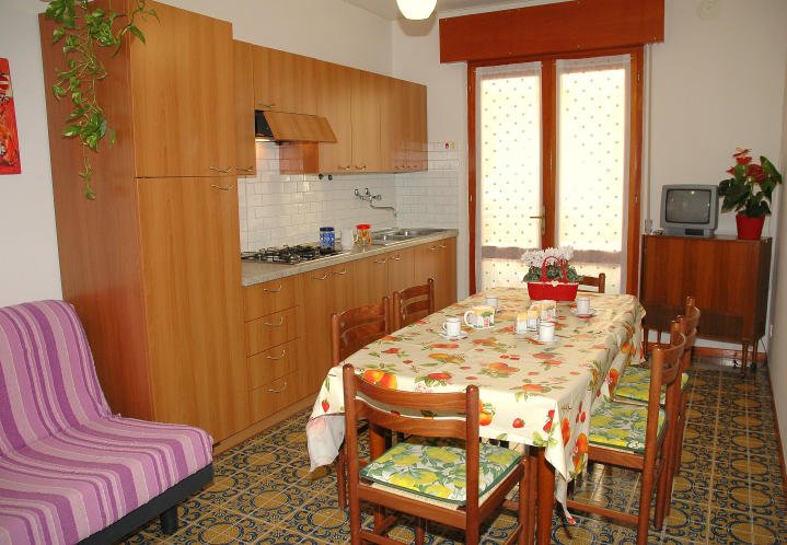 Type C: 5 people - Ground floor apartment with living room with television (Italian channels only) with kitchenette with 240-liter two-door refrigerator and terrace, one double bedroom, one 3-bedded room with terrace, bathroom with shower (shower tray and curtain).