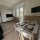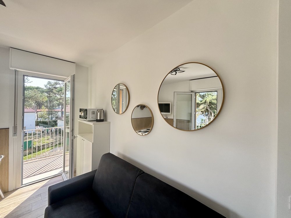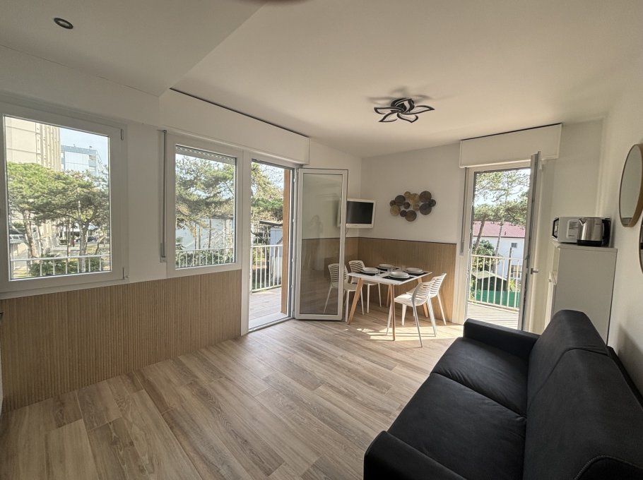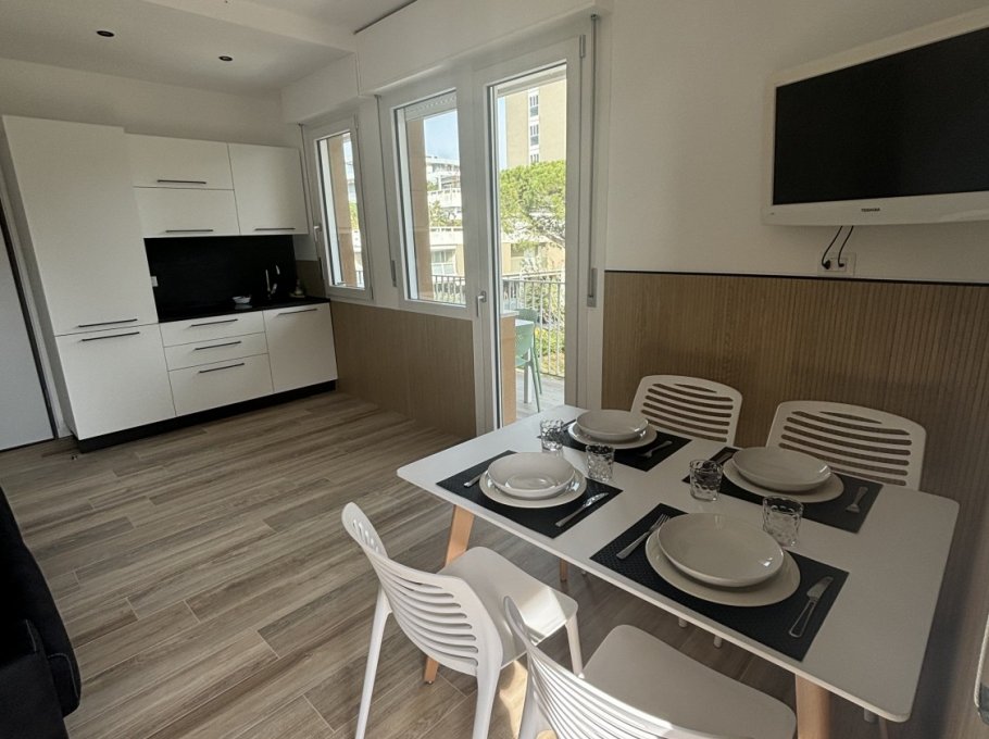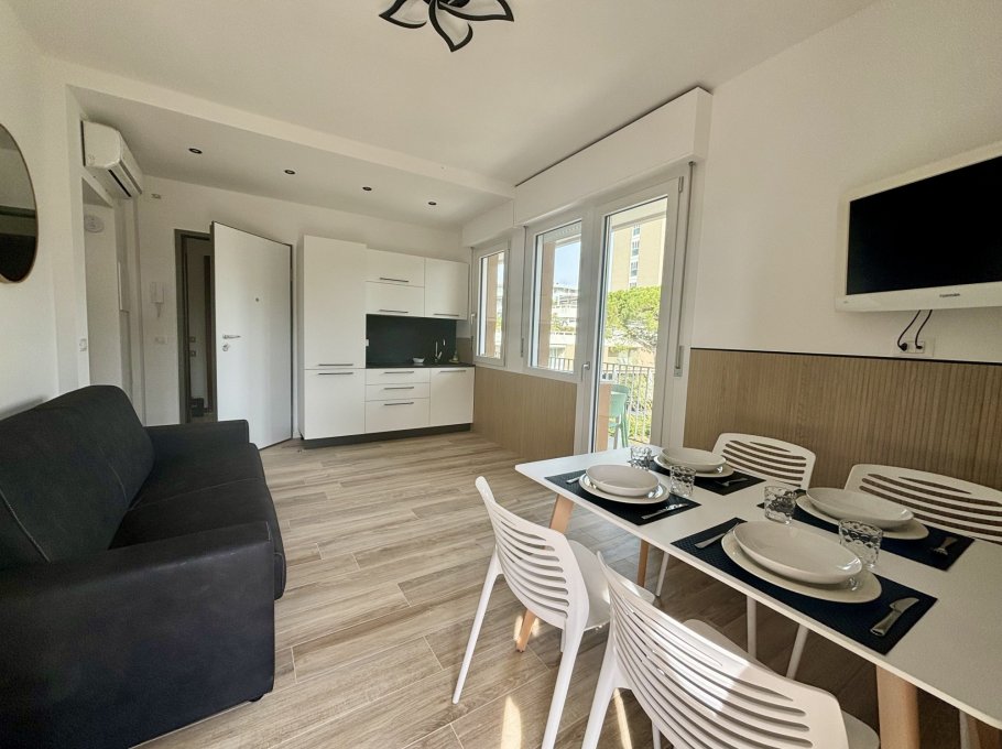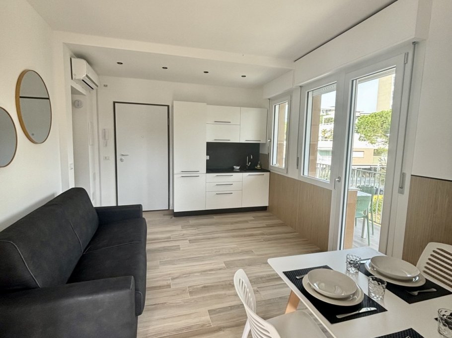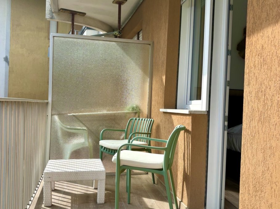 The property comprises a living room with sofa bed, terrace with table and chairs, kitchenette, bathroom with shower, and double bedroom with a relaxing terrace.