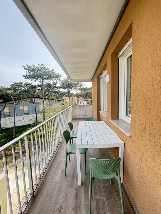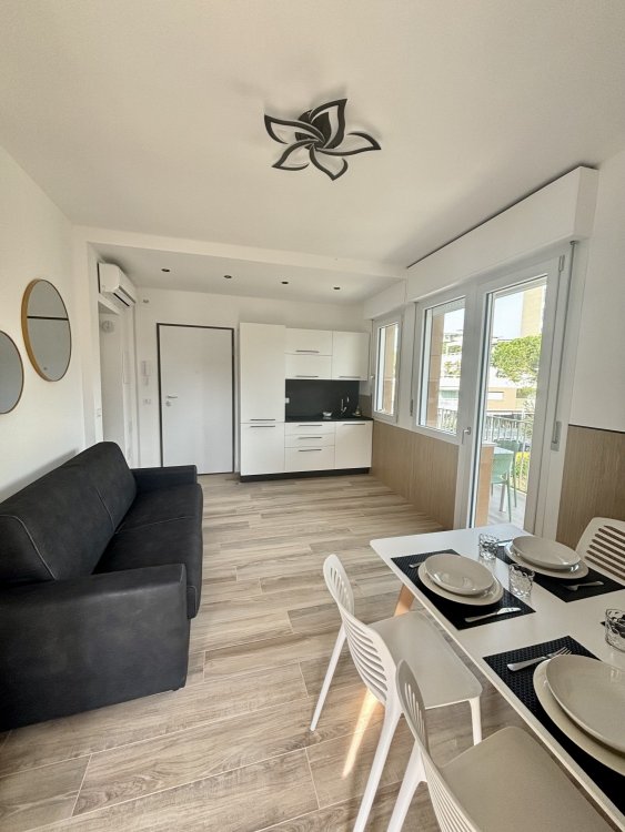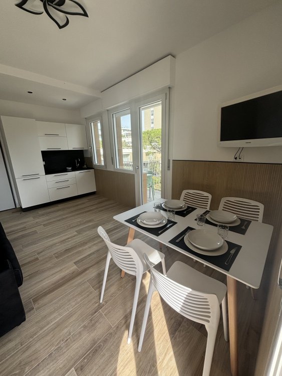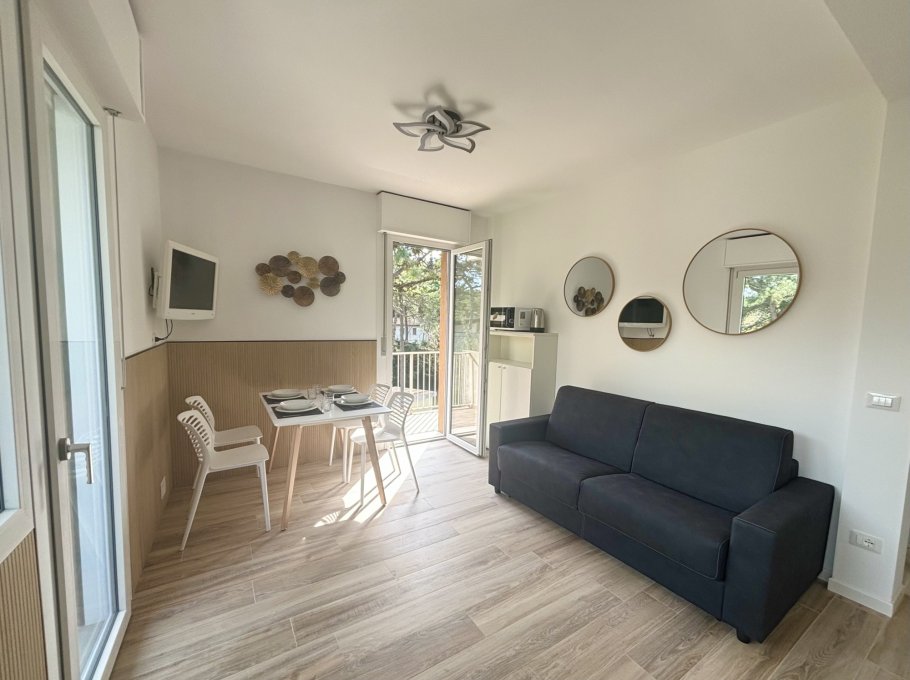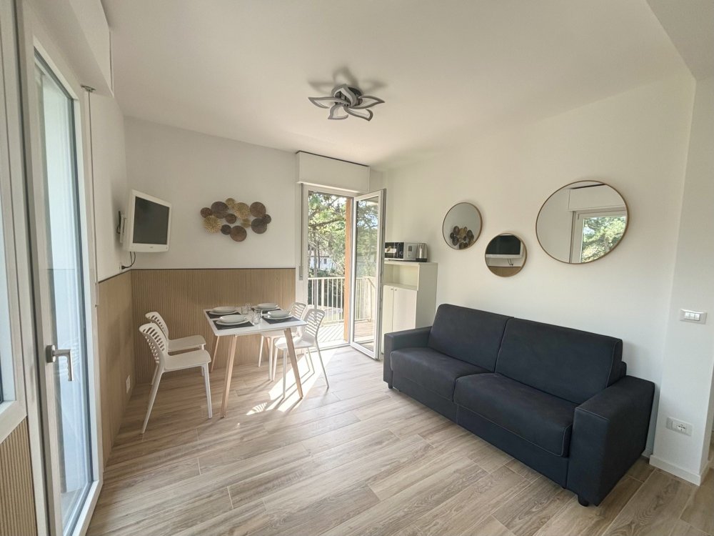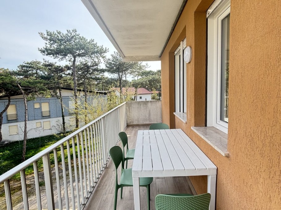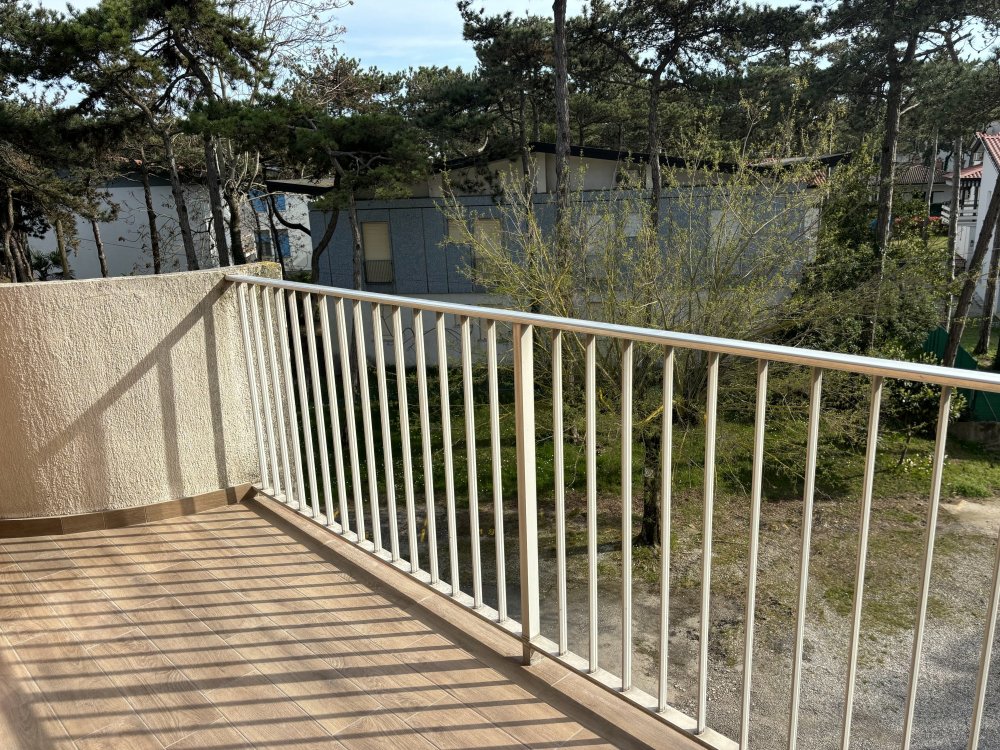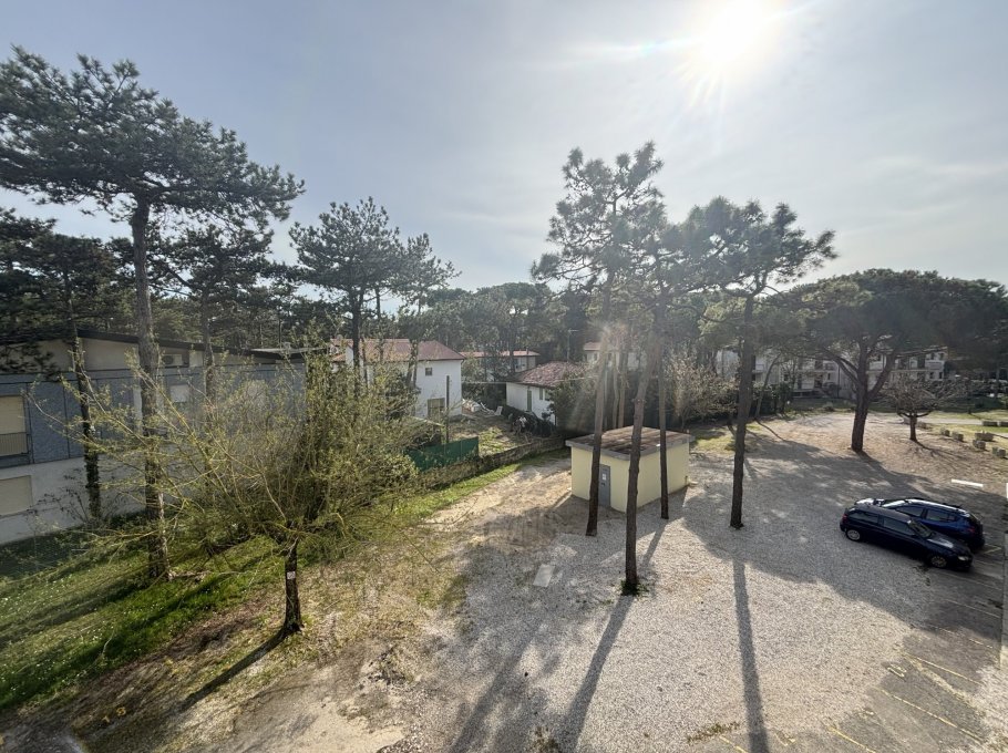 This condominium is located in the central area of Lignano Pineta, 650 meters from the beach. It features a large private parking area with numbered parking spaces.