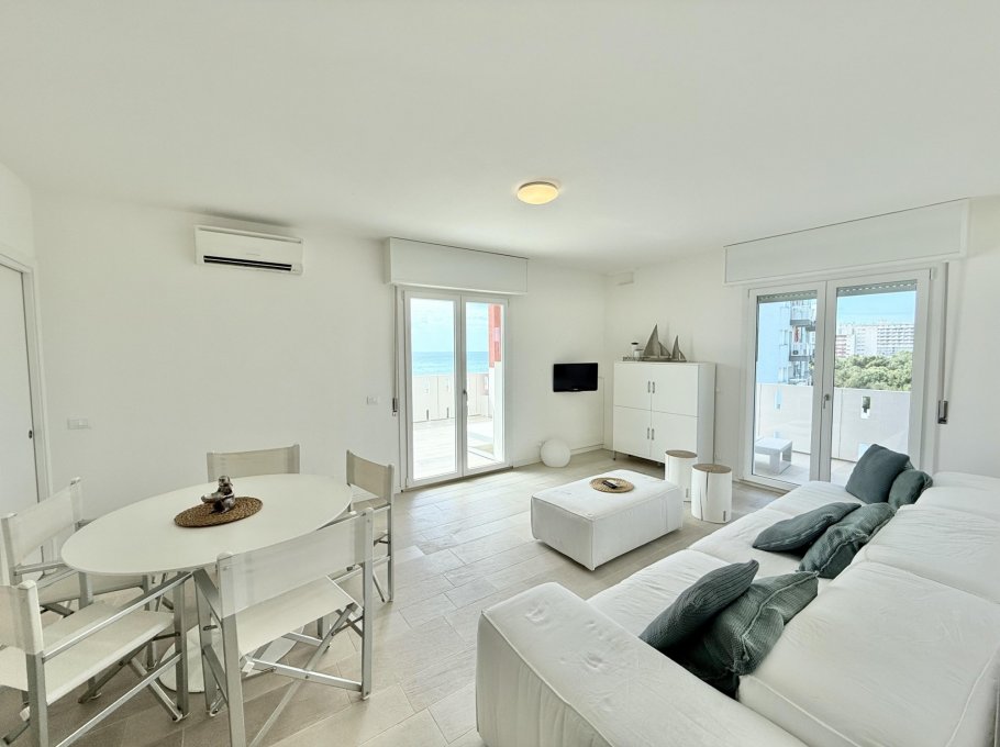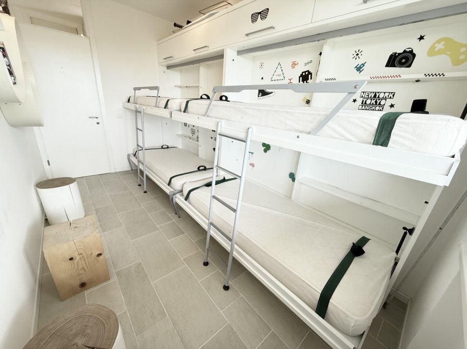 The apartment is at Luna Residence which is located at the beach promenade, near to the center of Lignano Sabbiadoro. On the ground floor of the residence are several shops, bars and restaurant. The apartment is on the 7° floor and is composed with 1 sleepingroom with doublebed, 1 sleepingroom with 4 beds, 1 livingroom with kitchen, two bathrooms with shower box, big balcony with front seaview and private-parking.TV, air conditioning and wasching machine.