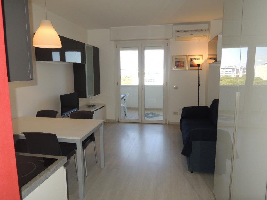 Completely renovated studio on the 7th floor, less than 100 meters from the beach, with large terrace on the east side, with a beautiful view; it is composed by a single room with double sofa bed, kitchen, bathroom with box shower; there is air conditioning, washing machine and numbered parking space (n°19).