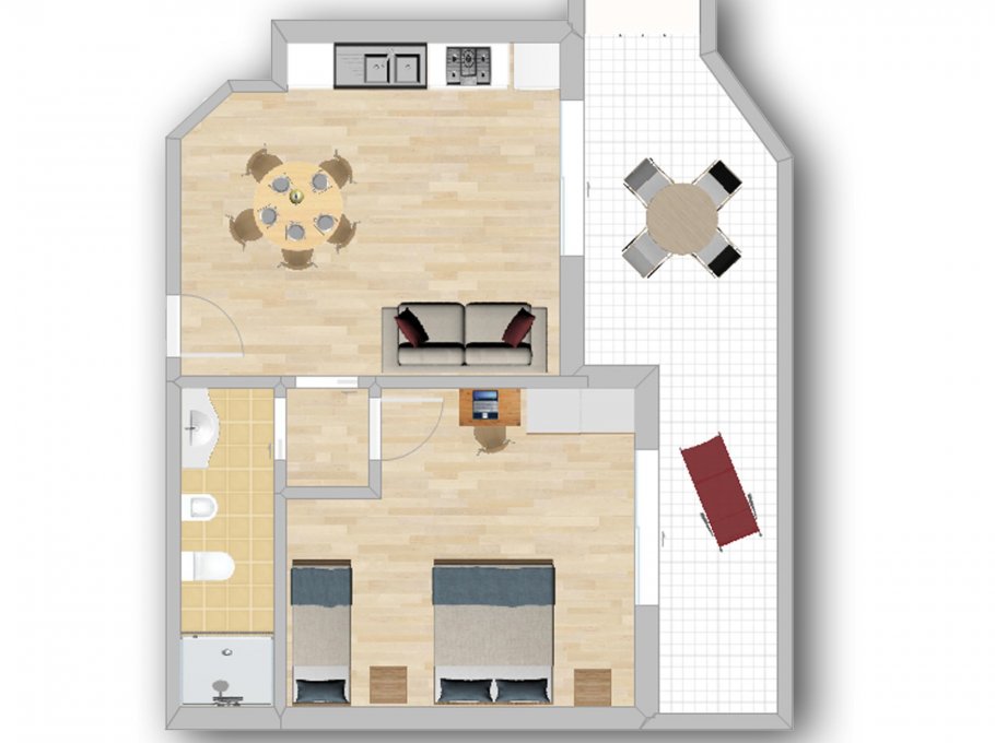 Резиденция Ноумеа, Новый номер, двухкомнатный. Имеется лифт. В номере: спальня с двуспальной и односпальной кроватями; гостиная-кухня с диван-кроватью на две персоны. Ванная комната с окном или без окна, душевой кабиной и биде. Большая терраса-балкон с боковым видом на море.