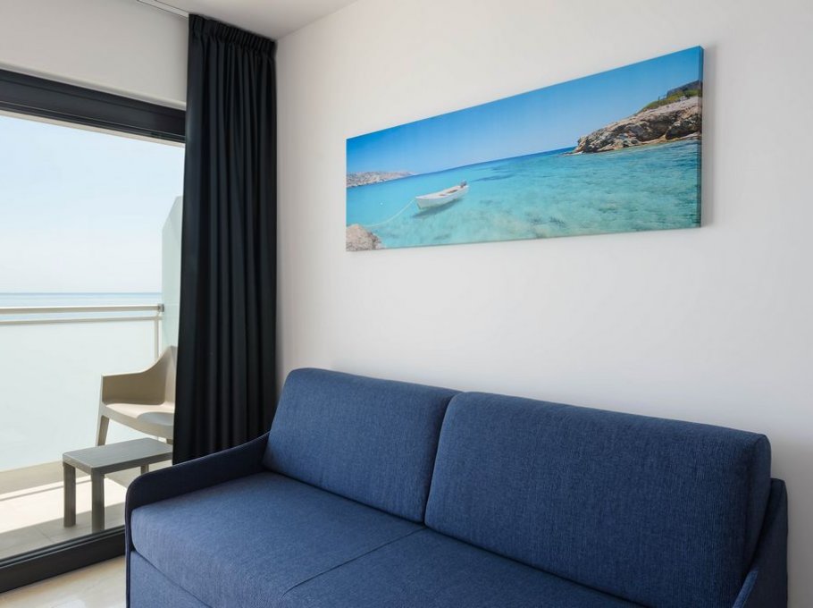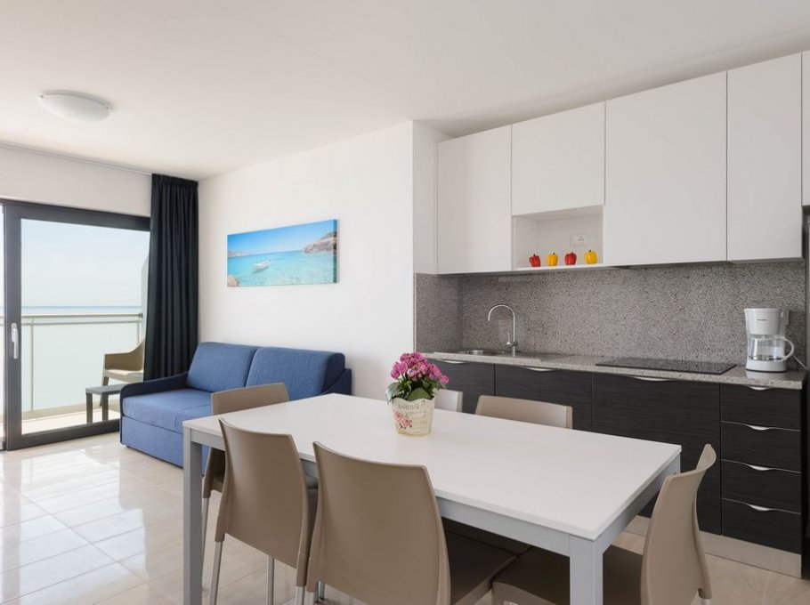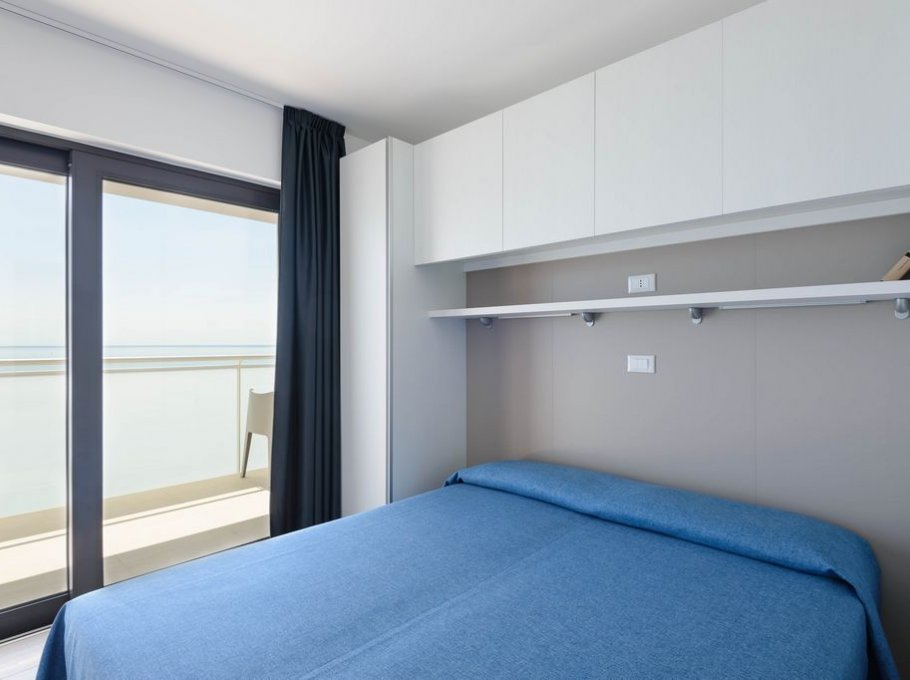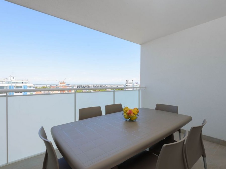 Type CX. Living-bed-room with kitchenette and double sofa bed, double bedroom, two-bedded-room, 2 bathrooms (1 without bidet). Big balcony with furniture and sunbeds. Lagoon view. Max 6 pax. 70 sqm