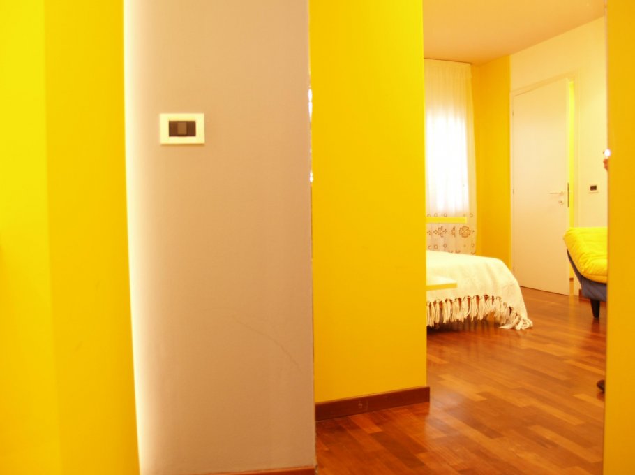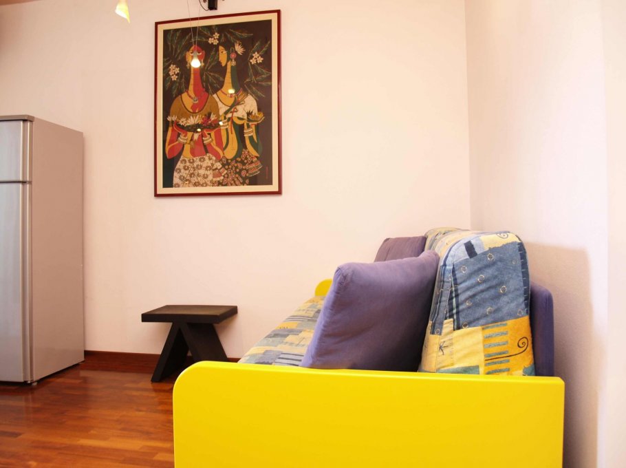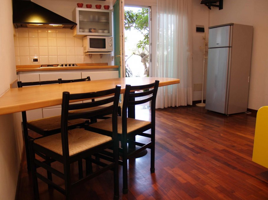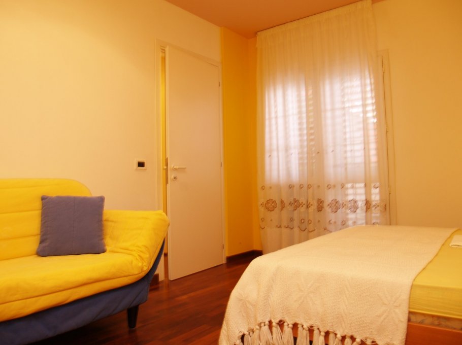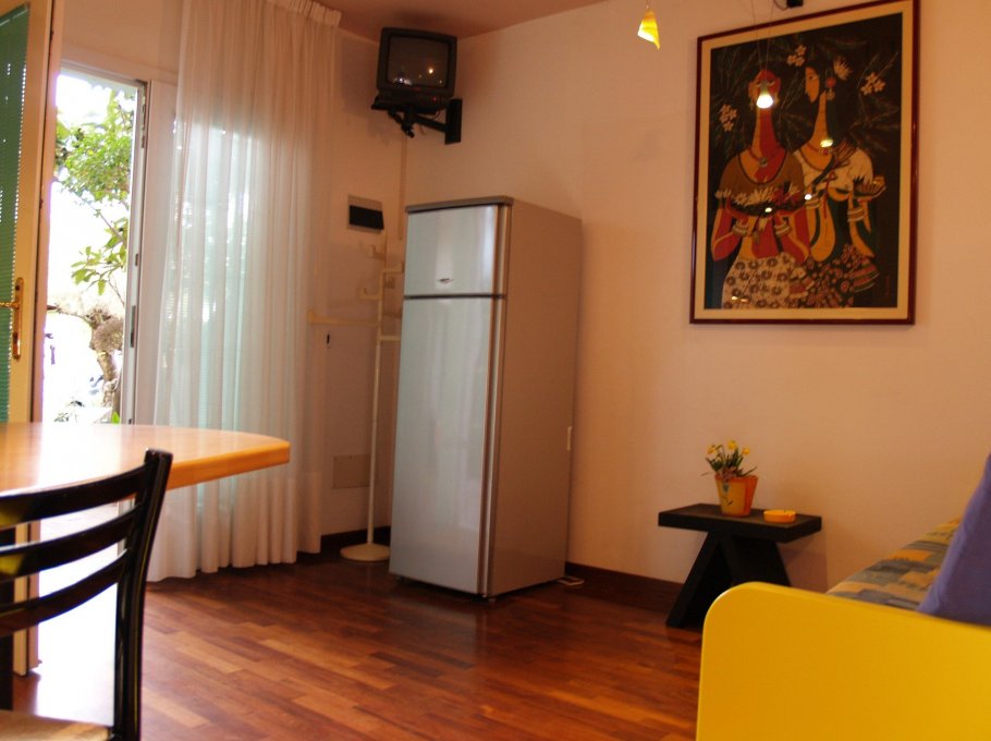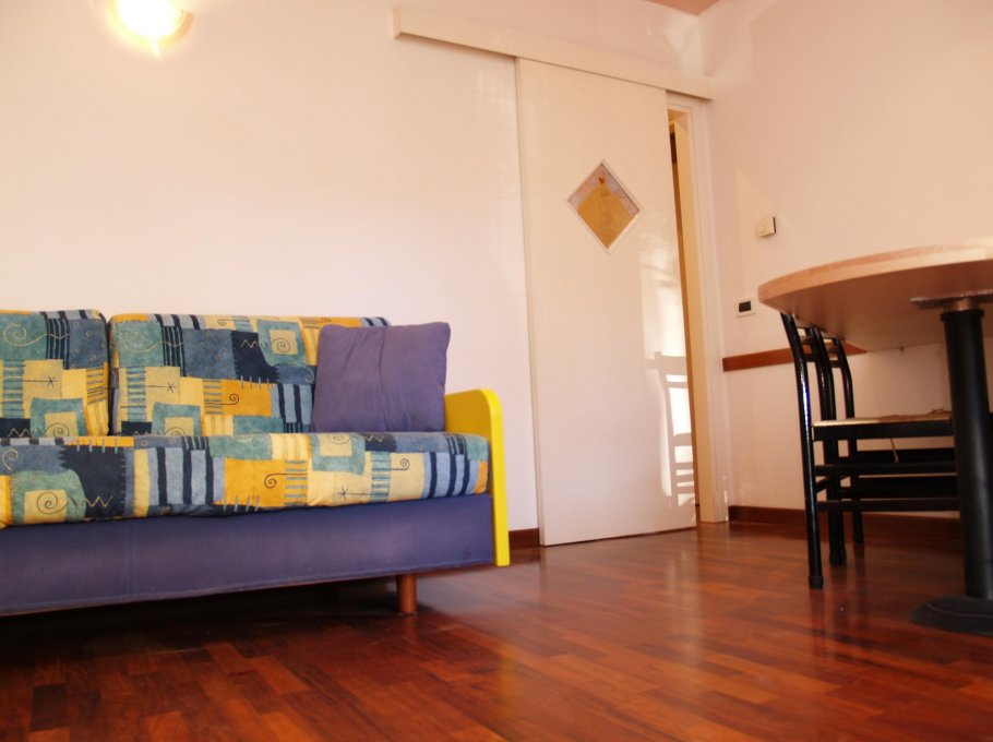 Composed of: living/dining room with kitchenette and 1 single sofa bed. Zone day/night separated by a sliding door, built-in wardrobe with shoe cupboard. Double bedroom + 1 single sofa bed. Equipped with French window onto terrace for common use. Bathroom with shower cabin, sink with cabinet, toilet.