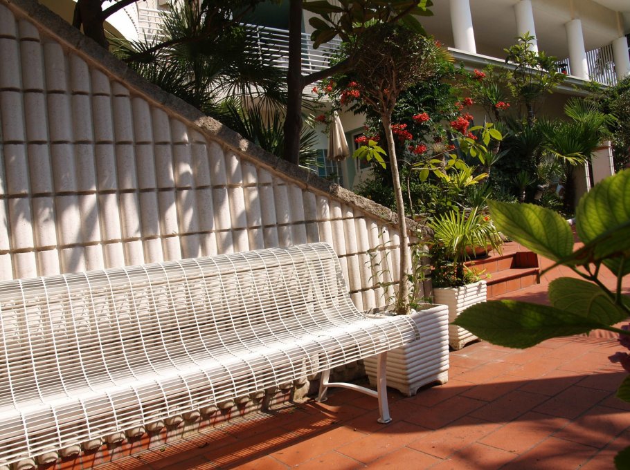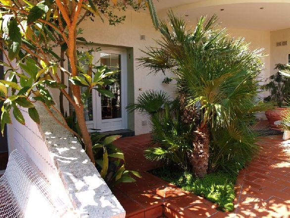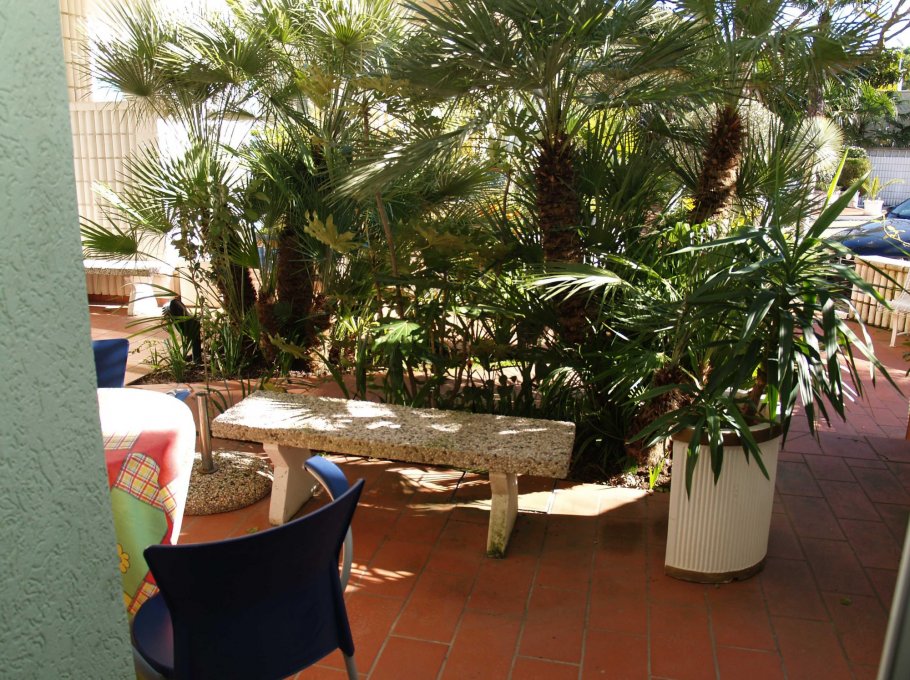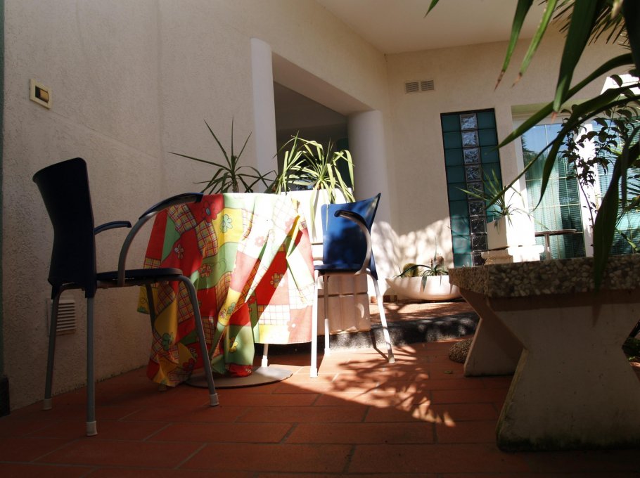 Outdoor patio overlooking the garden, furnished with table, bench, chairs with armrests and umbrella.