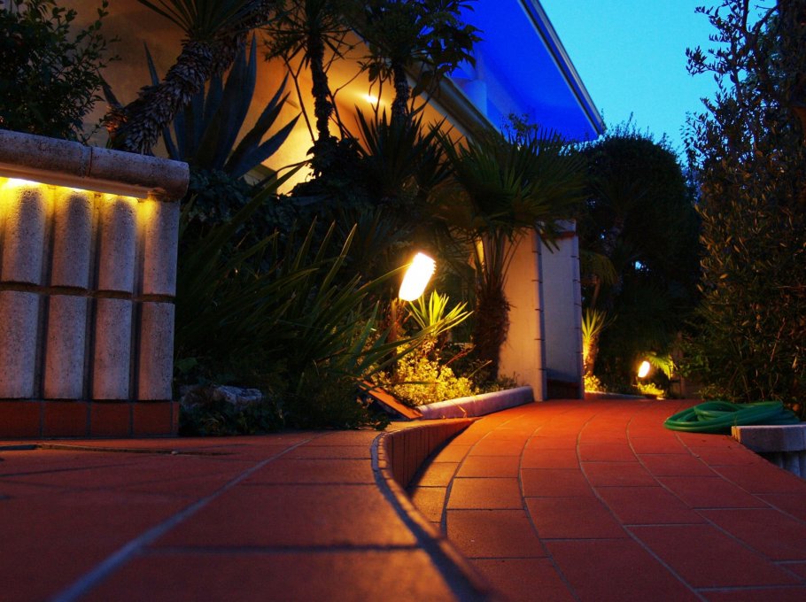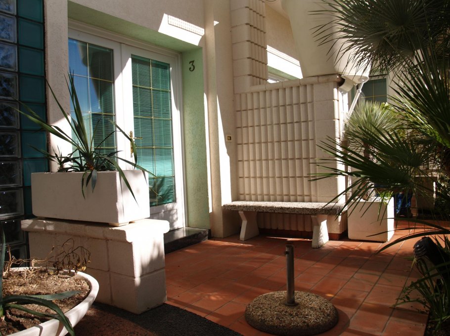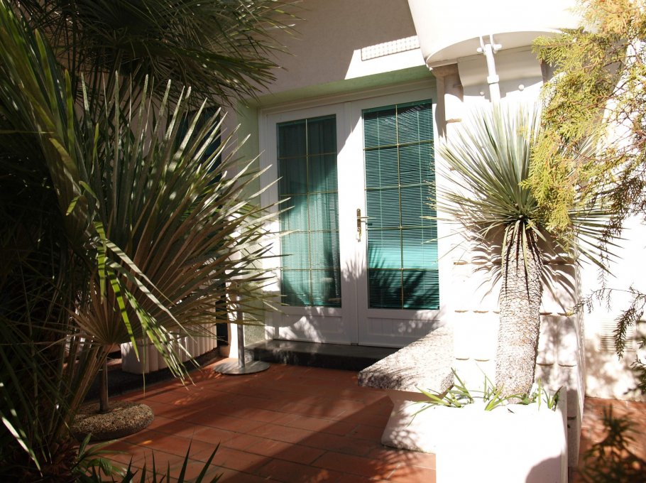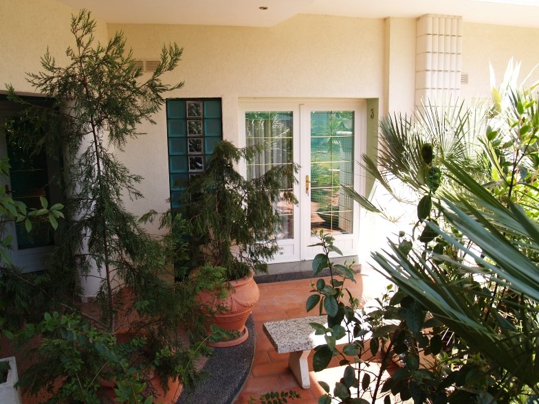 Outdoor patio overlooking the garden, furnished with table, bench, chairs with armrests and umbrella.