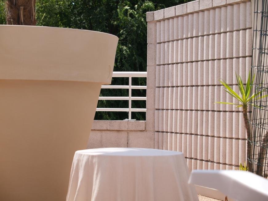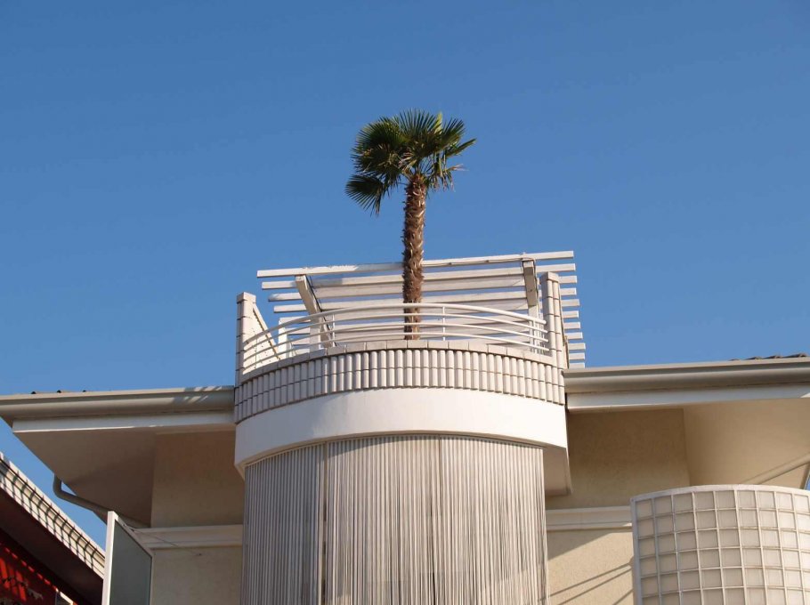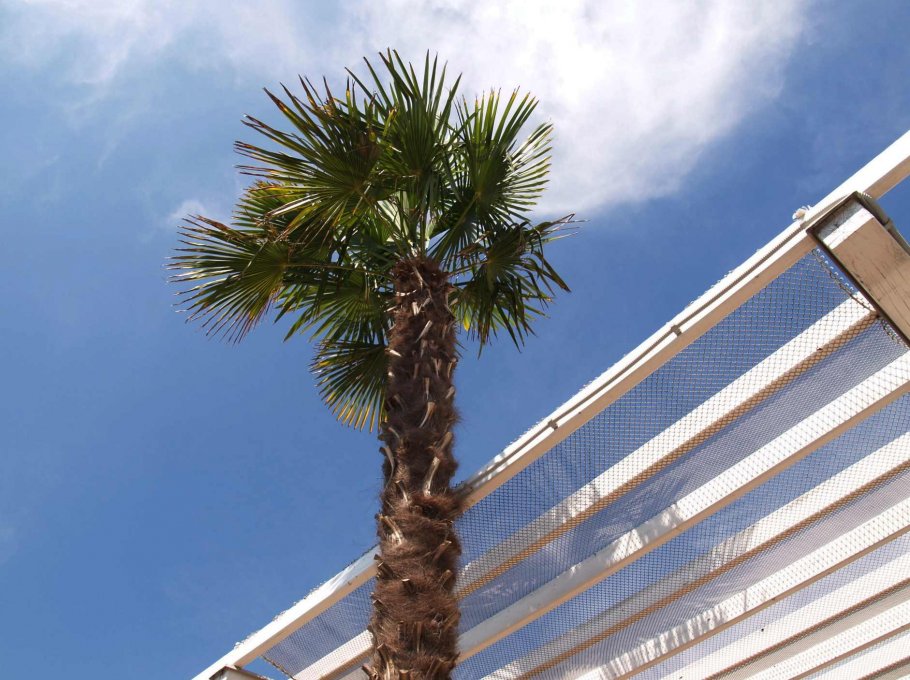 The enviable solarium terrace of this apartment is decorated with a giant palm tree in a giant vase and a pergola.