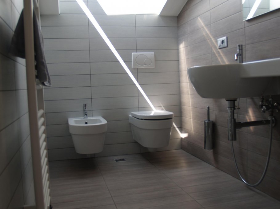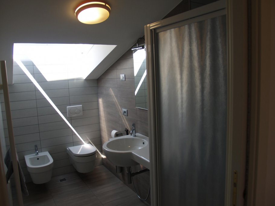 Bathroom with roof window, shower box, washbasin with mirror, toilet and radiator/towel radiator.