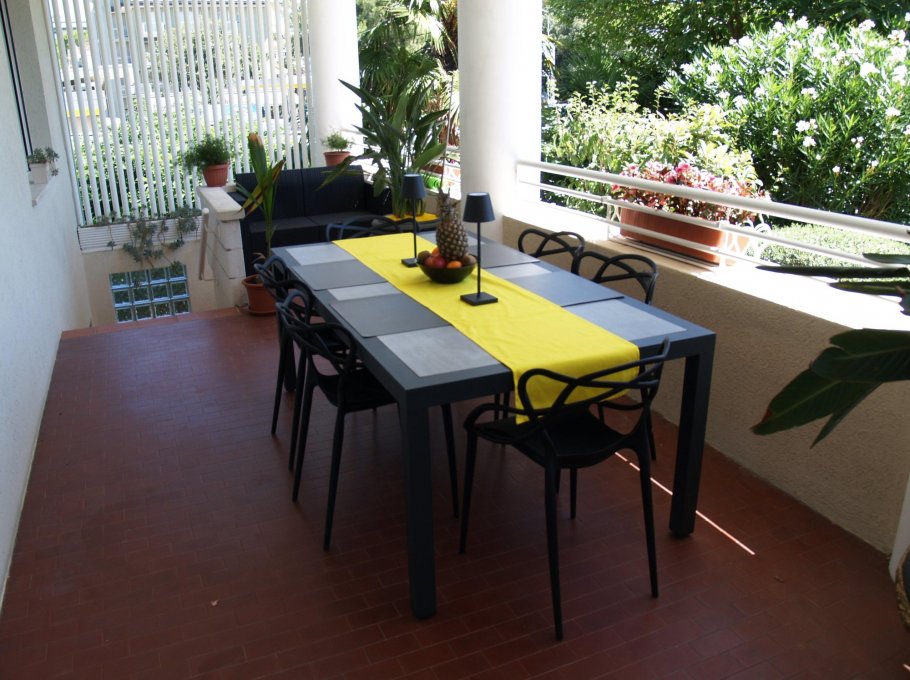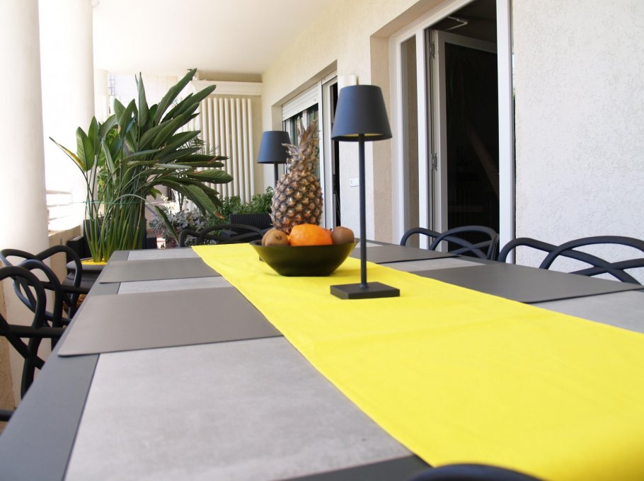 The enviable terrace of this apartment is adorned with a large outdoor dining table, seating area and potted plants.