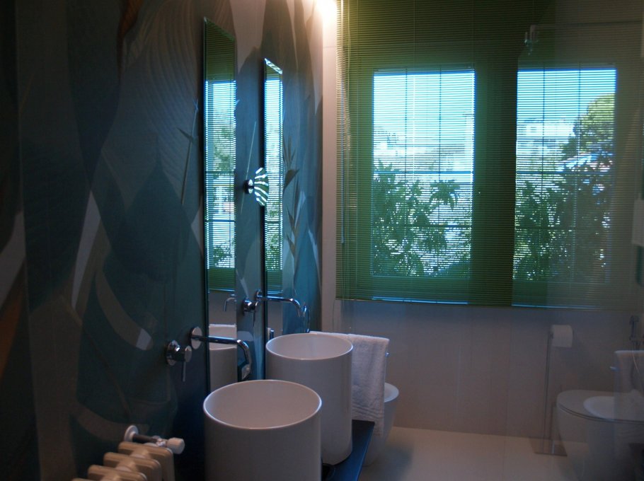 Bathroom with window, shower cabin, 2 sinks with mirrors, sanitary ware and pressure shower.