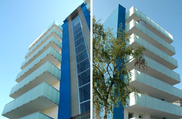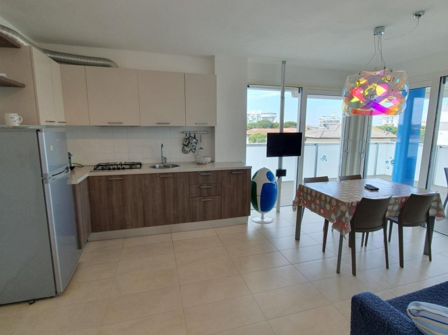 Stella d’Oriente has been developed over six floors served by a lift, each floor having two apartments completely separated by a landing. Type C: 4/5 persons - New apartment with quality finishes. The sleeping area consists of a double bedroom with patio door, a bedroom with two single beds, bathroom with shower cubicle and door-window, 2nd bathroom with shower cubicle. Living area with living room / dining room with sofa bed, television and opens with a double sliding glass door to the terrace to "L". Equipped with table and chairs is also easily accessible from the sleeping area. The kitchenette is equipped with refrigerator from 240 lt (separate freezer), dishwasher and microwave.