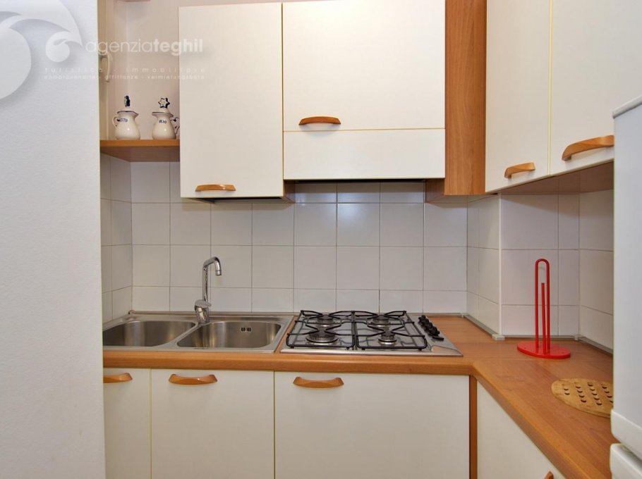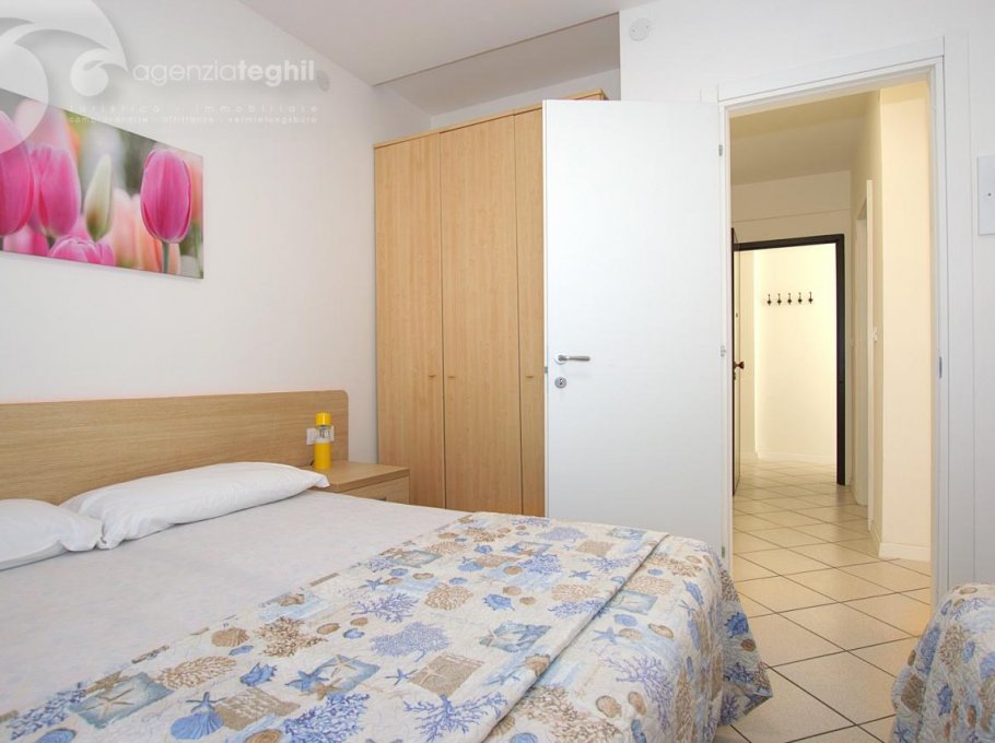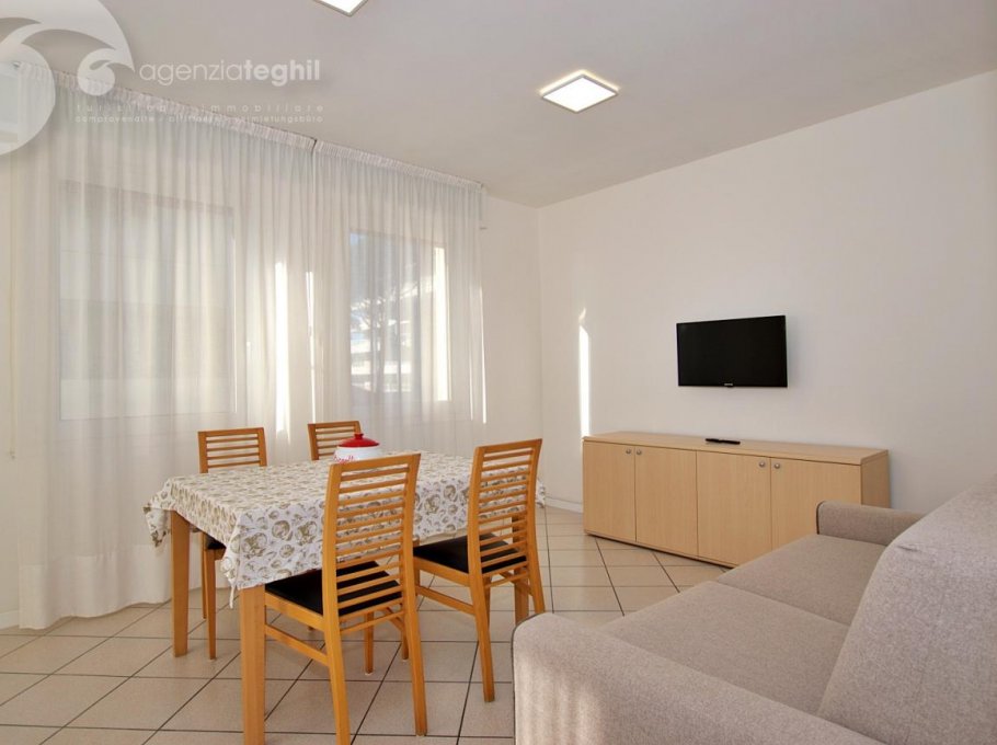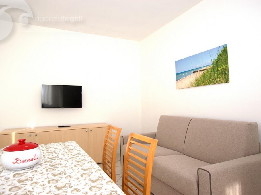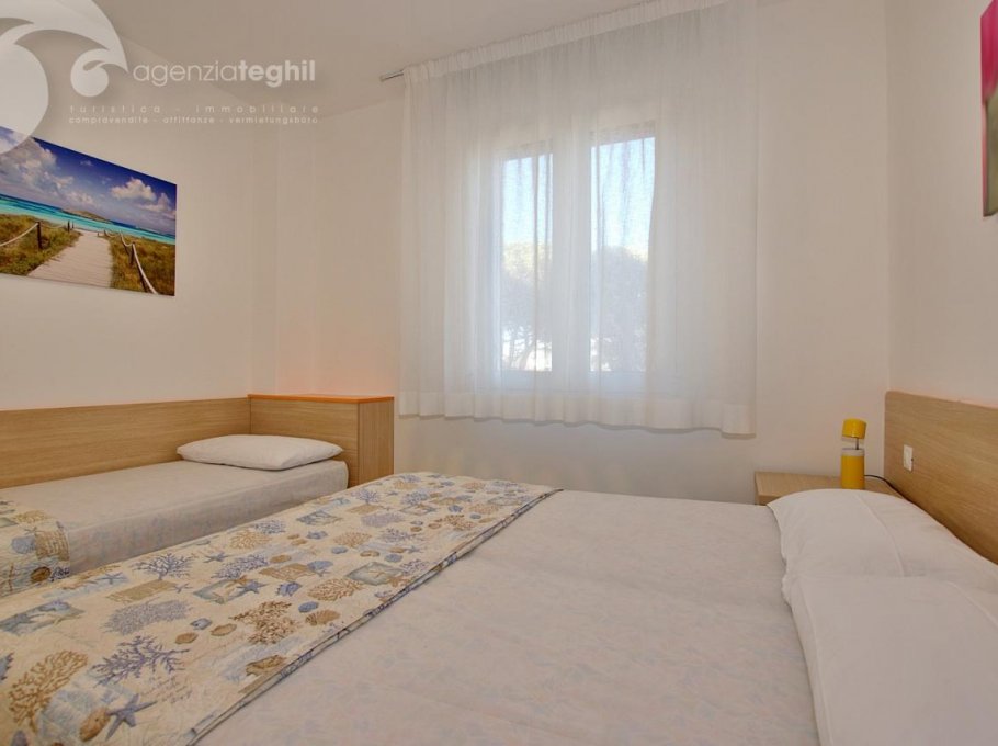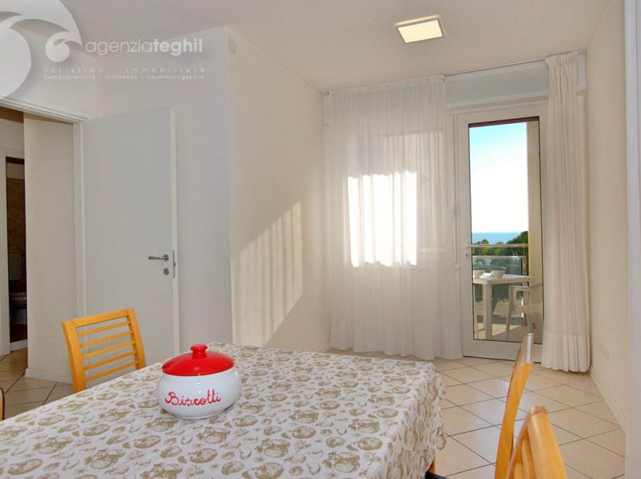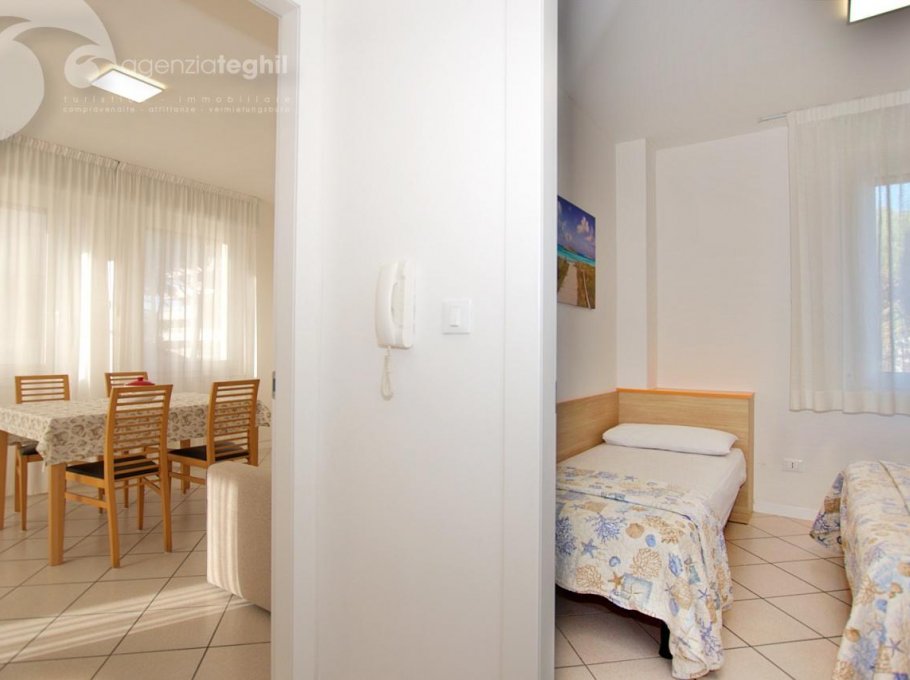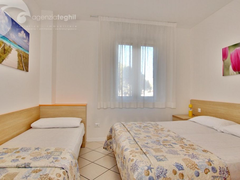 Type B: 3/4 persons - Apartment on the 3rd floor (elevator) consists of one 3-bedded room, living room with a sofa bed, television (with Italian programs only) and small balcony sea view equipped with table and chairs. Separate kitchenette with fridge double door 240 lt., microwave. Windowed bathroom with shower box.