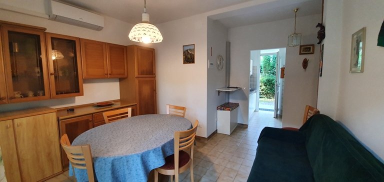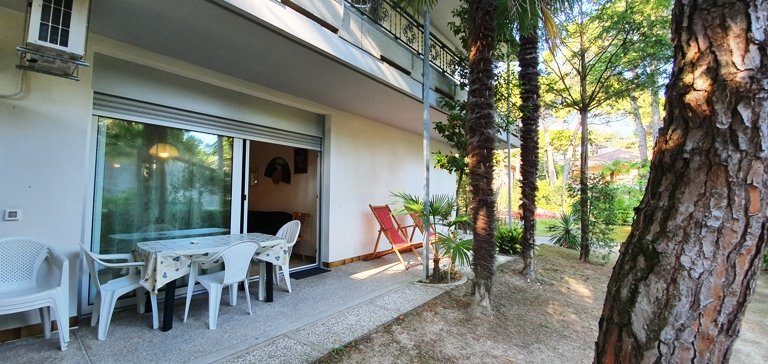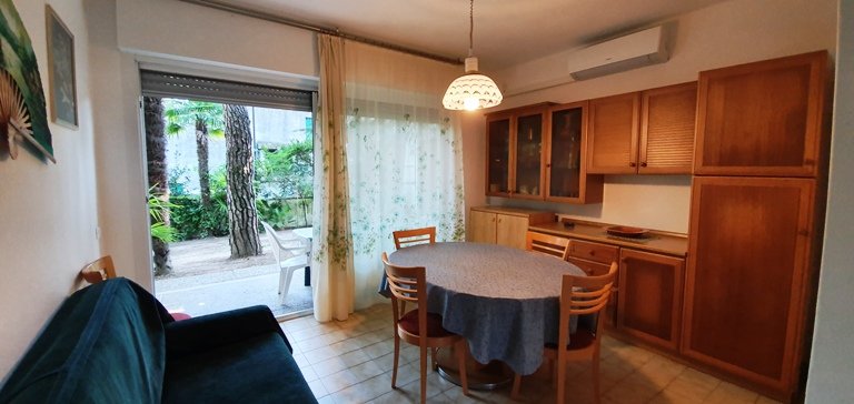 casa con 4 appartamenti in zona tranquilla, ma centrale di Lignano Pineta. L'appartamento è situato al piano terra ed è composto da soggiorno, angolo cottura, una camera matrimoniale, una camera con tre letti, bagno con doccia. Giardino condomoniale e posto auto.