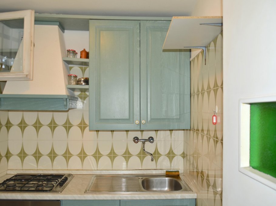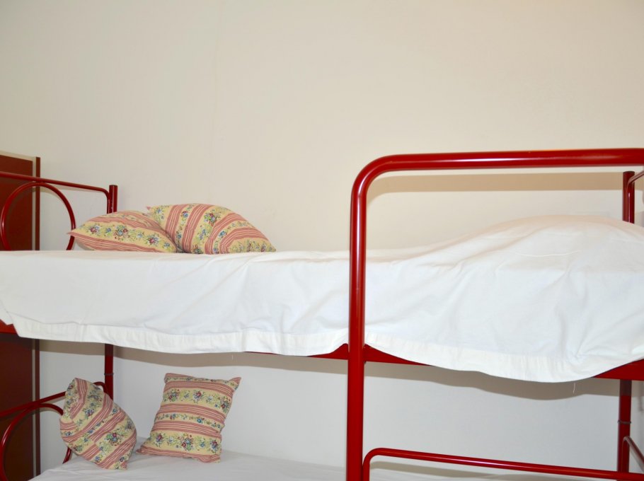 Row house divide into two floors: on the garden level living-dining room with sofa bed, kitchen, patio with garden furnishings and fireplace; on the first floor 1 double bedroom, 1 room with bunk bed, 1 bathroom with shower/WC, balcony. For 4-5 people. Ideal for families with children.Wit hair conditioning.
