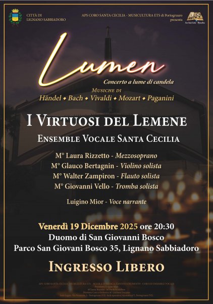 On Friday, December 19 at 8:30 p.m., the concert “Lumen” will take place at the Cathedral of Lignano Sabbiadoro, featuring the orchestra I Virtuosi del Lemene and the Ensemble Vocale Santa Cecilia of Portogruaro.
