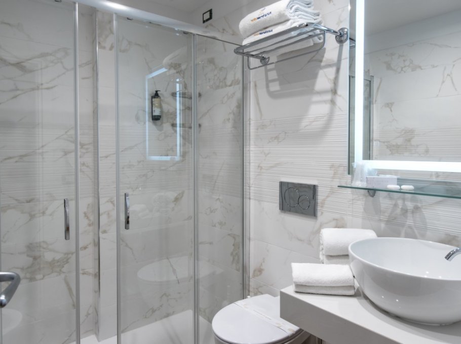 Struttura vecchia, moquettes annerite nelle scale e corridoi, porte dei bagni in alluminio stile uffici anni 70, rifiniture nei bagni approssimative, la porta della stanza non si apre del tutto perché l'armadio all'interno e' fuori dimensione, la TV non ha mai funzionato nonostante l'immediata segnalazione. Non è un 4 stelle.