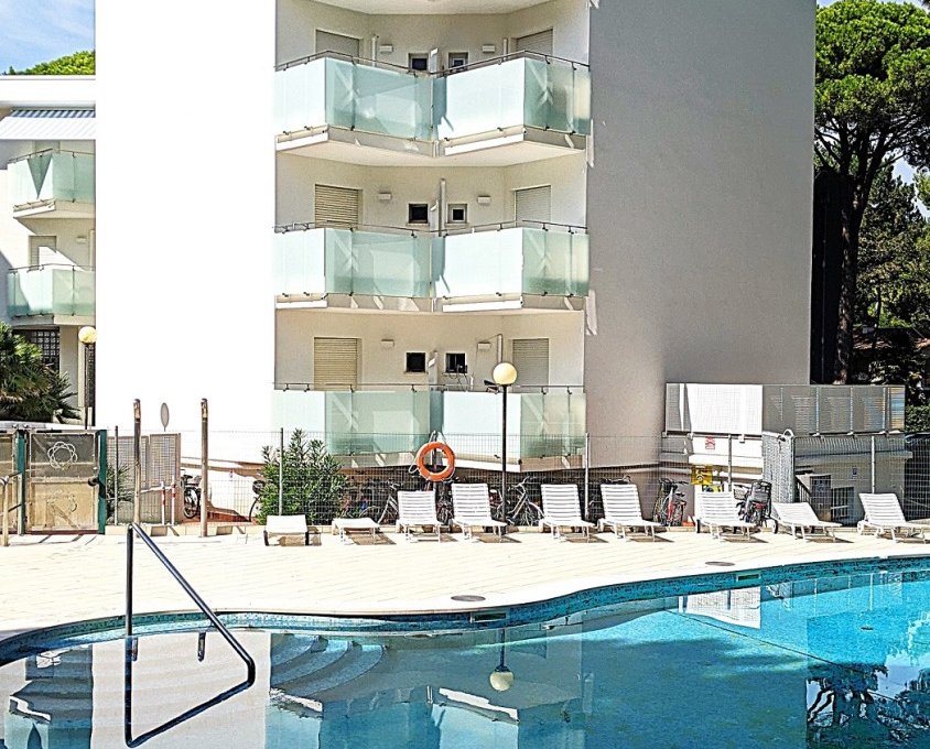 Holiday complex composed of 2 different buildings on 4 floors, located in a quiet and verdant area, about 250 m from the beach. Spacious hall with reception, lifts, large swimming-pool and 1 numbered parking-place for each apartment. Apartments with balcony and television.