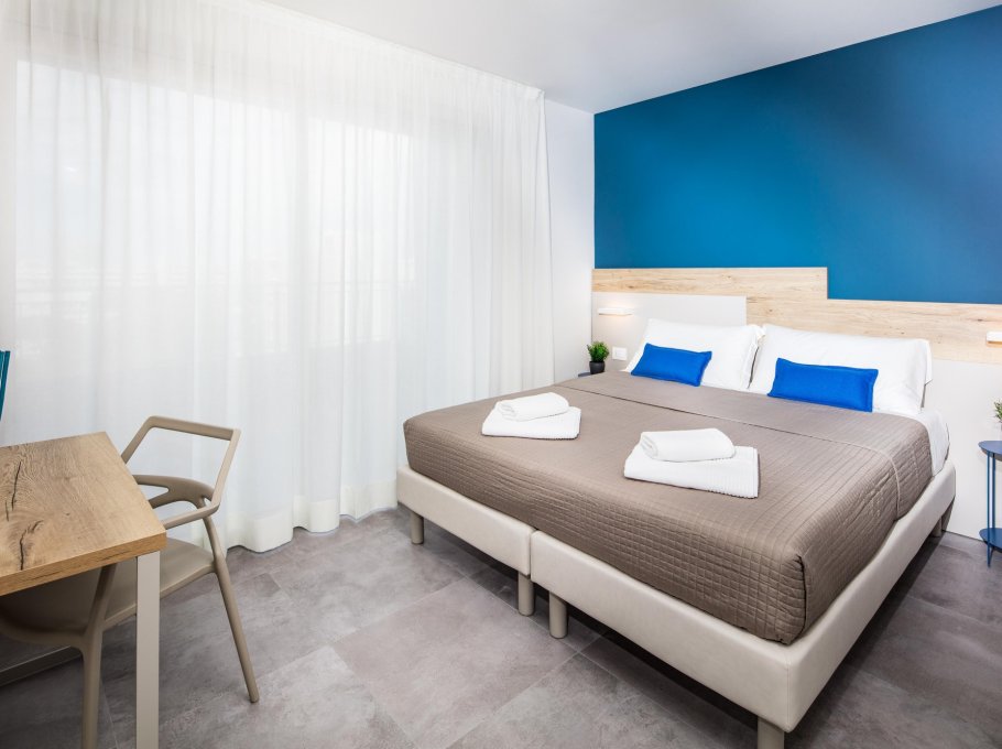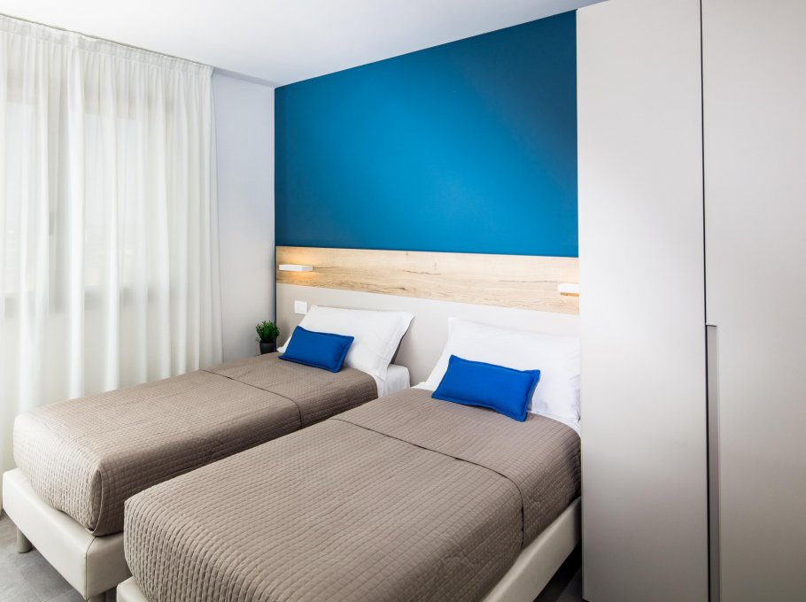 A modern and functional structure, composed by 55 units, of various sizes and full optional, from the large double rooms, to the two-rooms apartments and three-rooms apartments, which can accommodate up to 6 people. All the flats have beautiful terraces with outdoor furniture, to enjoy the beautiful view of the sea, the city and the lagoon of Marano. Furnished with ultra-modern design interiors, all the apartments are equipped with every comfort, including hotel services, such as bed linen, complementary toiletries, free Wi-Fi and LCD TV.