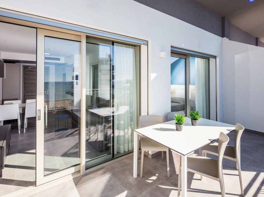 A modern and functional structure, composed by 55 units, of various sizes and full optional, from the large double rooms, to the two-rooms apartments and three-rooms apartments, which can accommodate up to 6 people. All the flats have beautiful terraces with outdoor furniture, to enjoy the beautiful view of the sea, the city and the lagoon of Marano. Furnished with ultra-modern design interiors, all the apartments are equipped with every comfort, including hotel services, such as bed linen, complementary toiletries, free Wi-Fi and LCD TV.