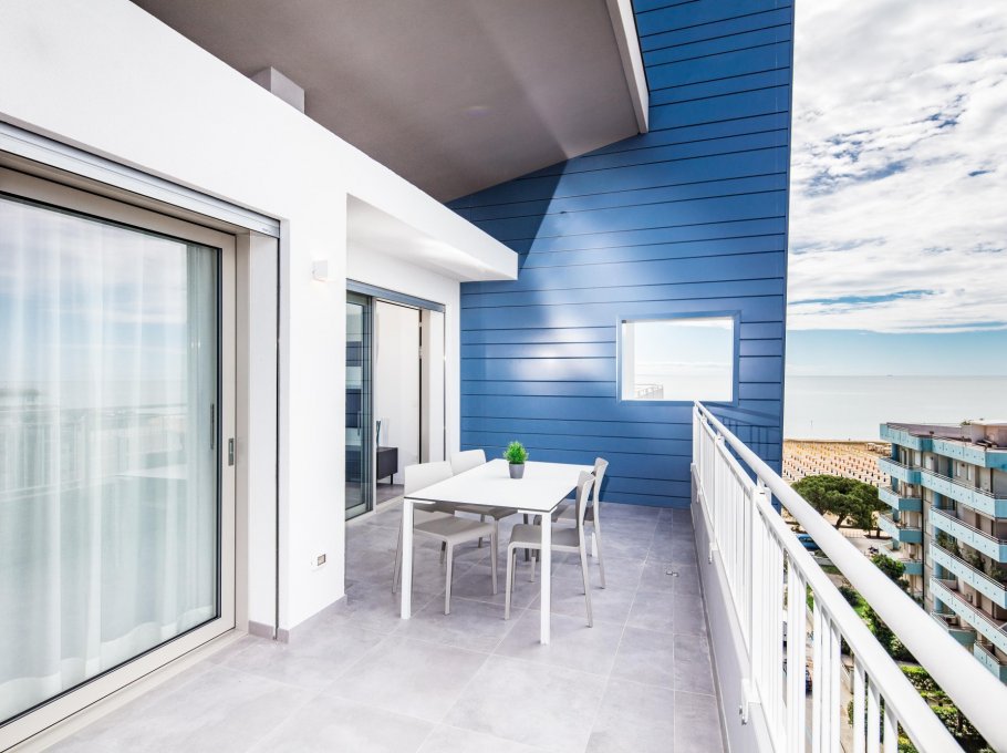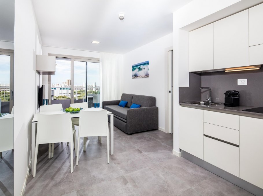 A modern and functional structure, composed by 55 units, of various sizes and full optional, from the large double rooms, to the two-rooms apartments and three-rooms apartments, which can accommodate up to 6 people. All the flats have beautiful terraces with outdoor furniture, to enjoy the beautiful view of the sea, the city and the lagoon of Marano. Furnished with ultra-modern design interiors, all the apartments are equipped with every comfort, including hotel services, such as bed linen, complementary toiletries, free Wi-Fi and LCD TV.