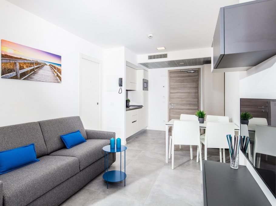 A modern and functional structure, composed by 55 units, of various sizes and full optional, from the large double rooms, to the two-rooms apartments and three-rooms apartments, which can accommodate up to 6 people. All the flats have beautiful terraces with outdoor furniture, to enjoy the beautiful view of the sea, the city and the lagoon of Marano. Furnished with ultra-modern design interiors, all the apartments are equipped with every comfort, including hotel services, such as bed linen, complementary toiletries, free Wi-Fi and LCD TV.