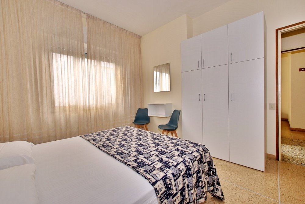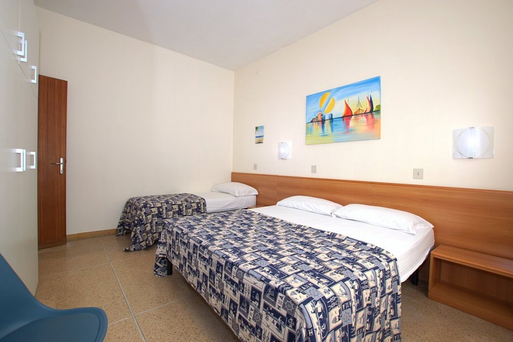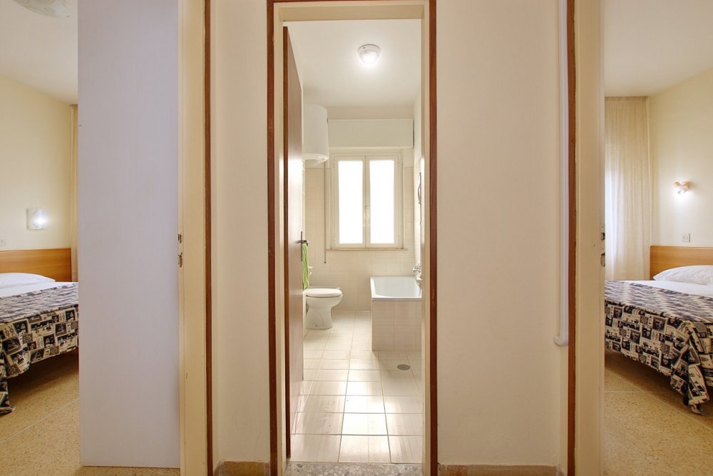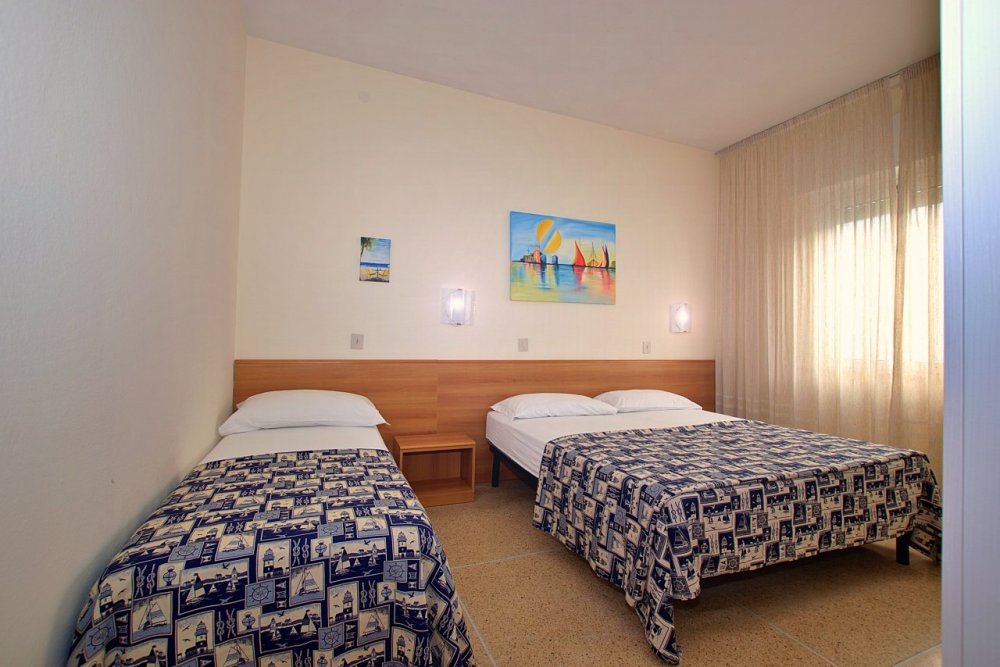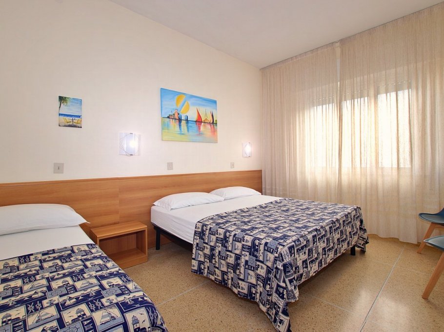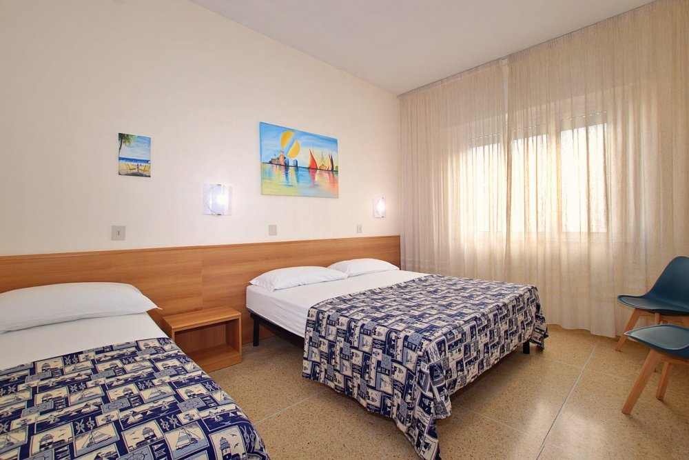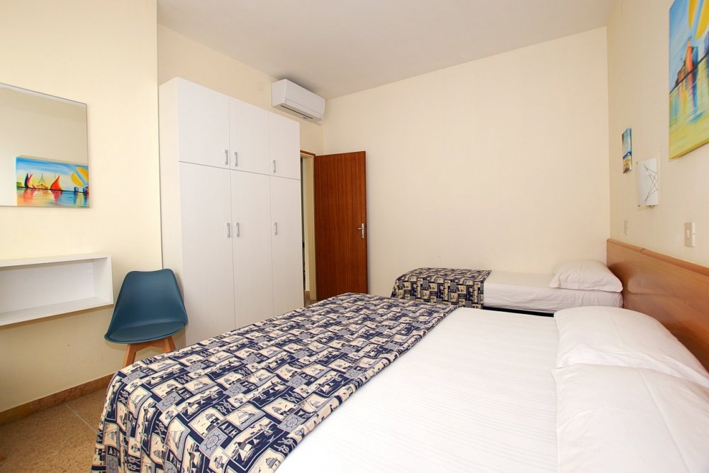 Type C - 5/6 people: Spacious apartment on the 3rd floor (no elevator) featuring a triple bedroom, a double bedroom, a bathroom with a window and a bathtub, a living room with a single sofa bed, and a terrace overlooking the seafront/beach, furnished with a table and chairs. Separate kitchen with a 240-liter double-door refrigerator, microwave, and dishwasher.
