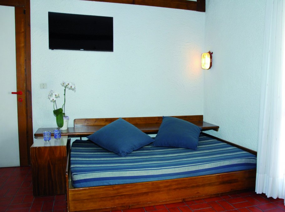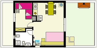 Two rooms apartment of 34 sqm. with terrace, fireplace for barbecue, outdoor table, awning, two deckchairs. Living room with double sofa-bed, kitchenette with fridge and freezer, microwave, TV/SAT, bedroom with bunk bed and access to a small balcony, bathroom with shower cubicle, air conditioning/heating, laundry supply and outdoor parking for one car. Rentable up to 4 people, children included.