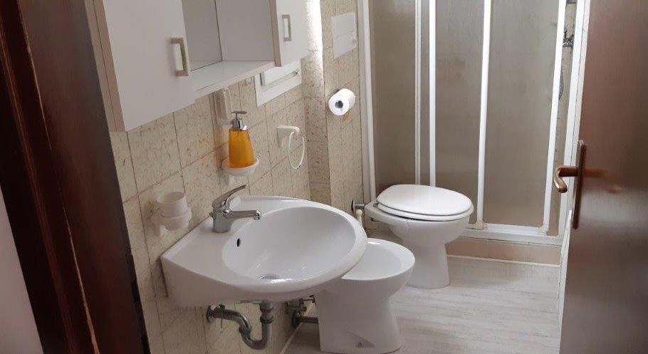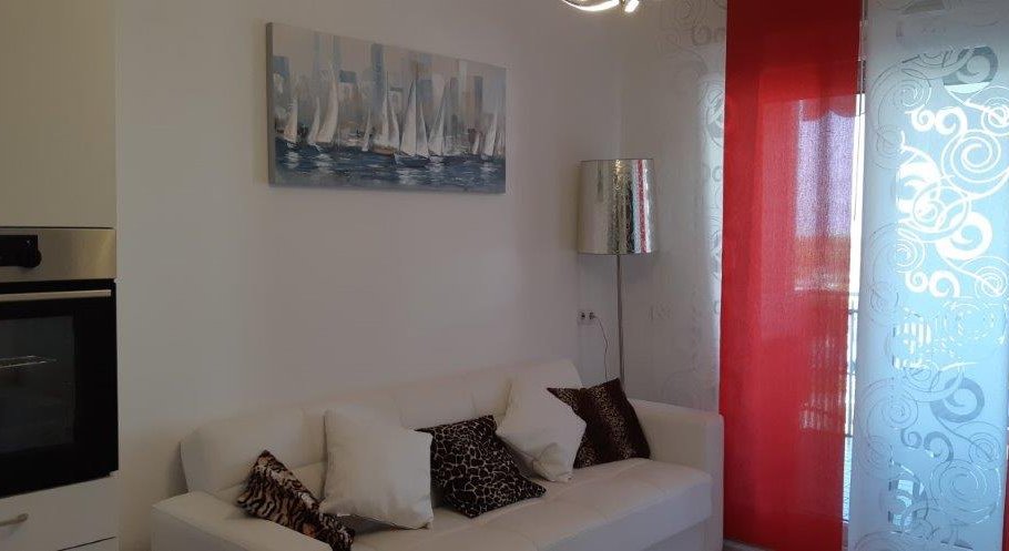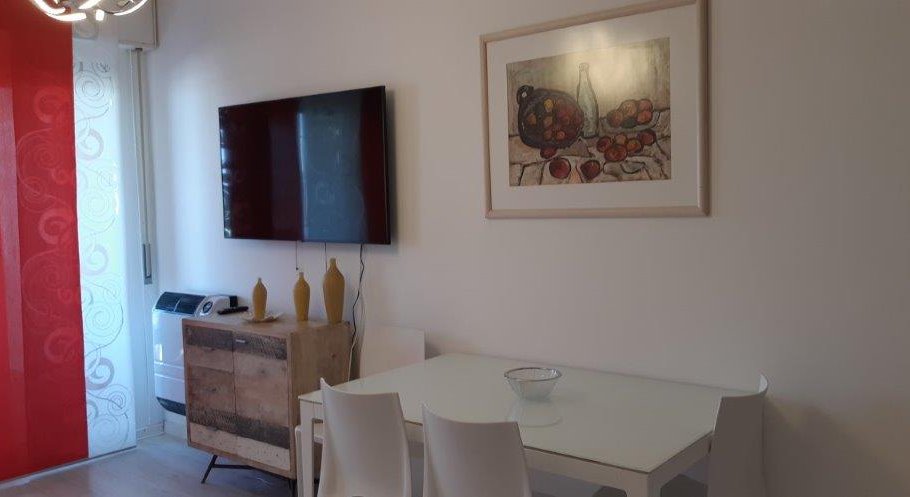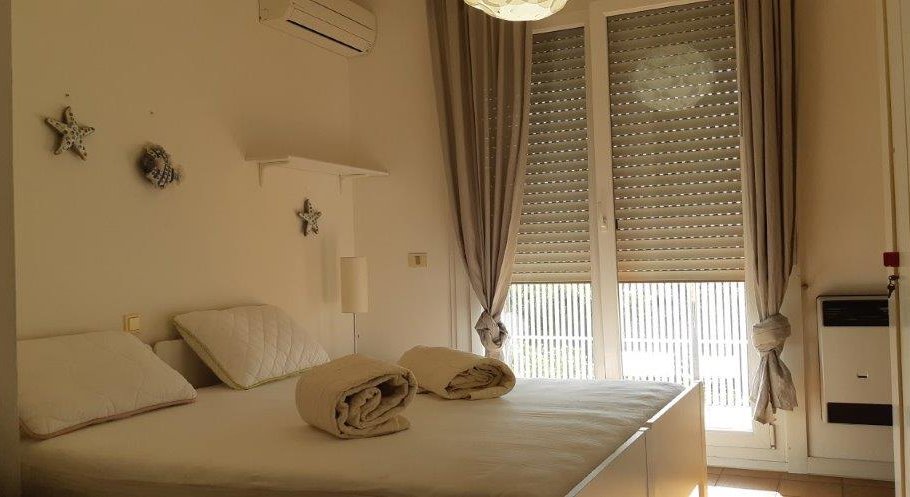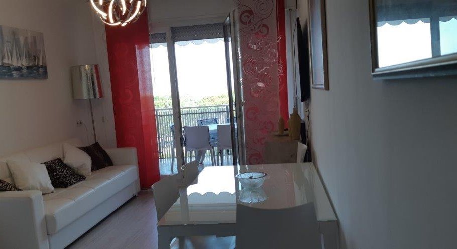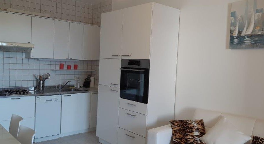 Two-room apartment on the 6th floor with lift, consists of: living room with kitchenette, terrace with panoramic view, double bedroom with bunk bed and double bed, terrace and bathroom with window. Equipped with air conditioning, Wi-Fi swimming pool and shared parking.