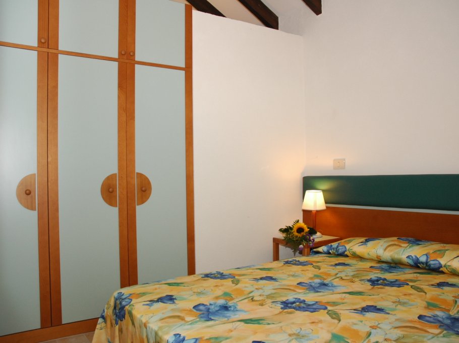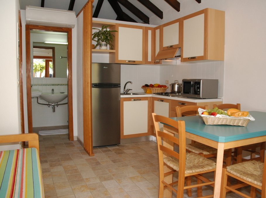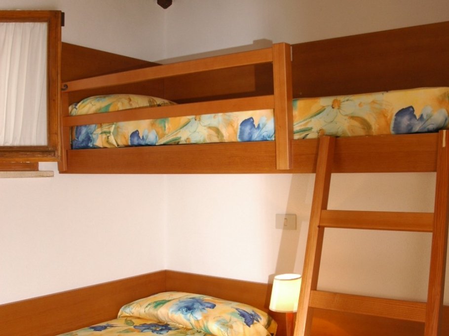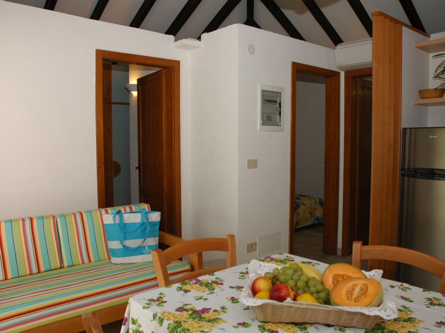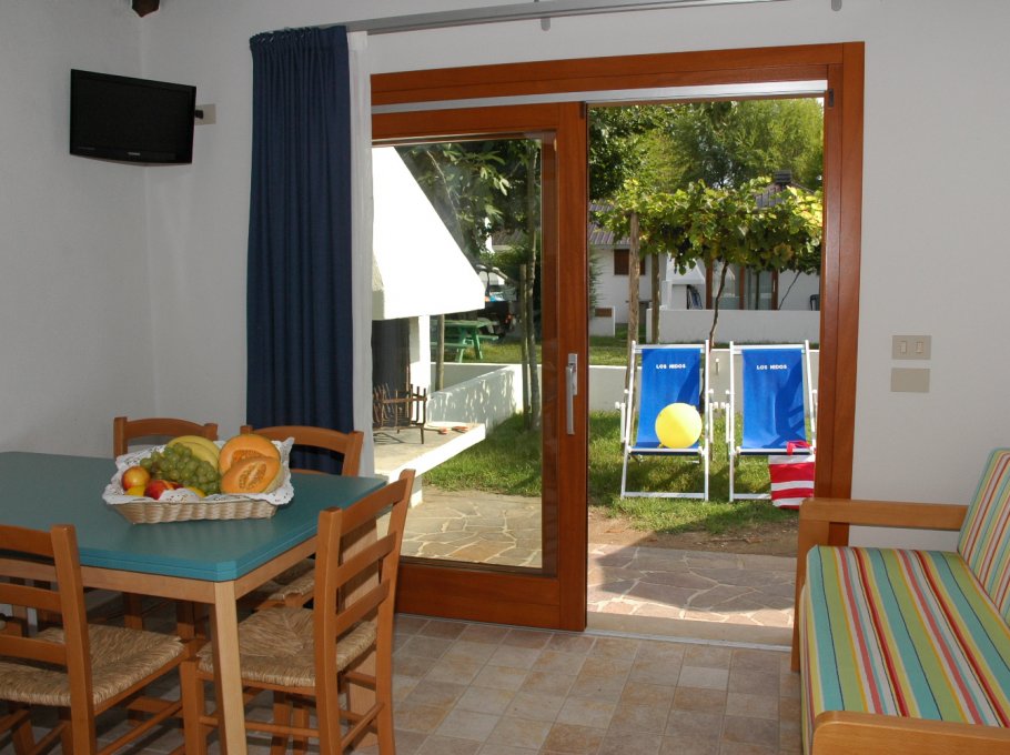 Small bungalows in modern style with interiors completely renovated, with 2 bedroom, one with a double bed and one with a bunk bed where an extra bed can be added upon request. Living room with kitchenette, provided with crockery, fridge with freezer, microwave, save box, air conditioning/heating, bathroom with shower cubicle, hair-drier. A luminous glass door connects the living room to the private garden equipped with table, chairs and barbecue, sun umbrella and two deckchairs. An outdoor parking space for one car is behind the house.
