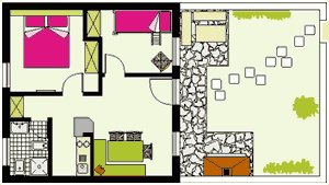 The bungalows "basic " have a simple, basic but functional style, the bungalow " classic " modern and functional style while the bungalows " classic plus " have a living room with a large sliding window overlooking the garden. The furnishing is modern and functional , and additionally in the living room , there is a comfortable sofa.