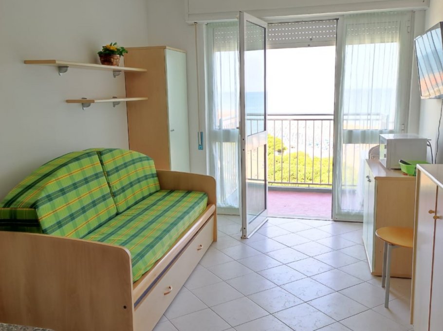 INTERNATIONAL (on the 8th floor, with great sea view) renewed apartment with one double sleeping-room, livingroom with double-couch, a folding-bed and kitchencorner, bathroom with shower and haidryer, small balcony (with great view to the sea), ceiling fan in living and sleeping room, parking-place and pool at the residence Marina included.