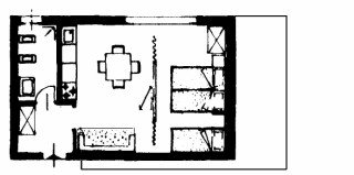 Spacious 1-room-apartment with 3 beds and single couch, cooking area, bathroom, big balcony.