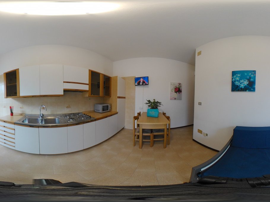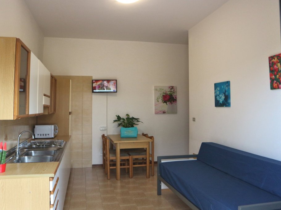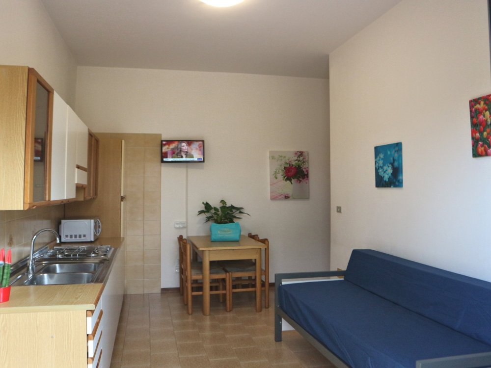 Two rooms apartment made up of dining room with cooking facilities, tv and single sofa bed, double bedroom, bathroom with shower/bidet/wc and wide terrace with table and chairs. Air conditioning, wi-fi and final cleaning are included in the price. In the rental rules of the agency are mentioned all the above written service’s ways. Parking place size: 5,00x2,50x3,00