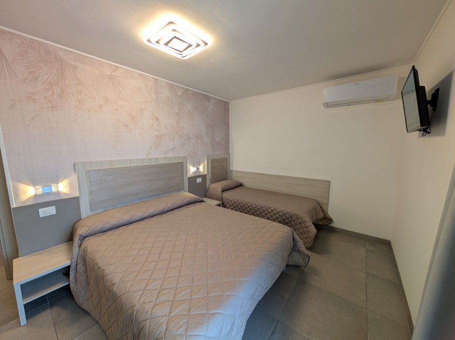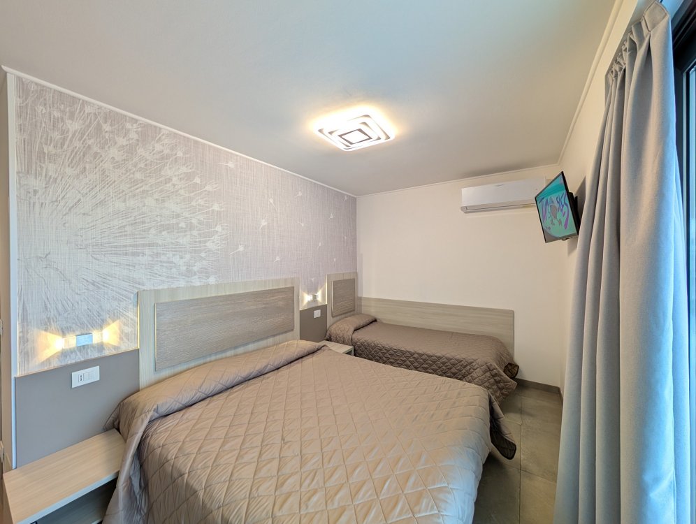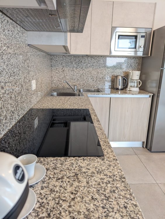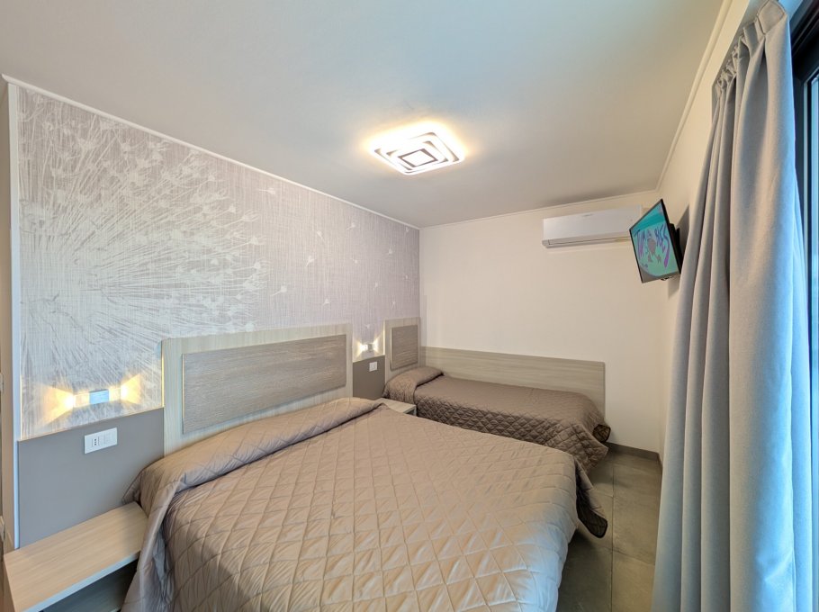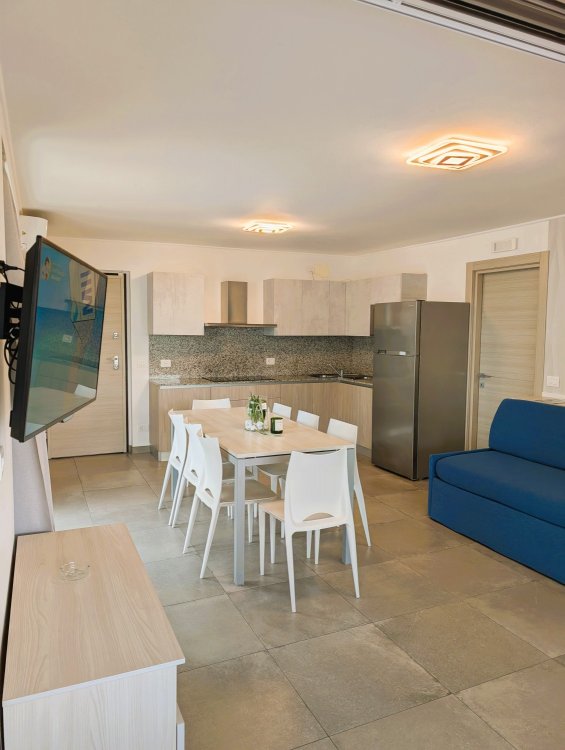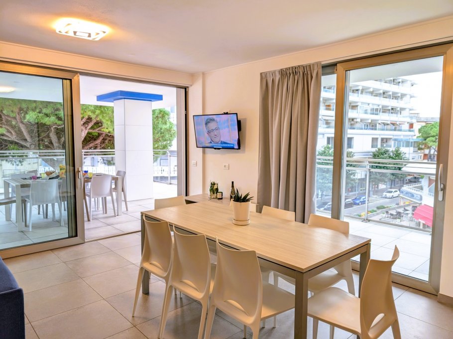 Block A. Type C8H. Apartment located on the 3. Floor and suitable for people with disabilities. Living-bed-room with kitchenette and double sofa bed, 2 three-bedded-room, 1 bathroom with accessible shower, 1 bathroom with enclosed shower, big balcony with furniture and sunbeds. Max 8 pax.