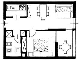 Apartment with 1 double-room, double divan bed in the living room, cooking area, bathroom, balcony.