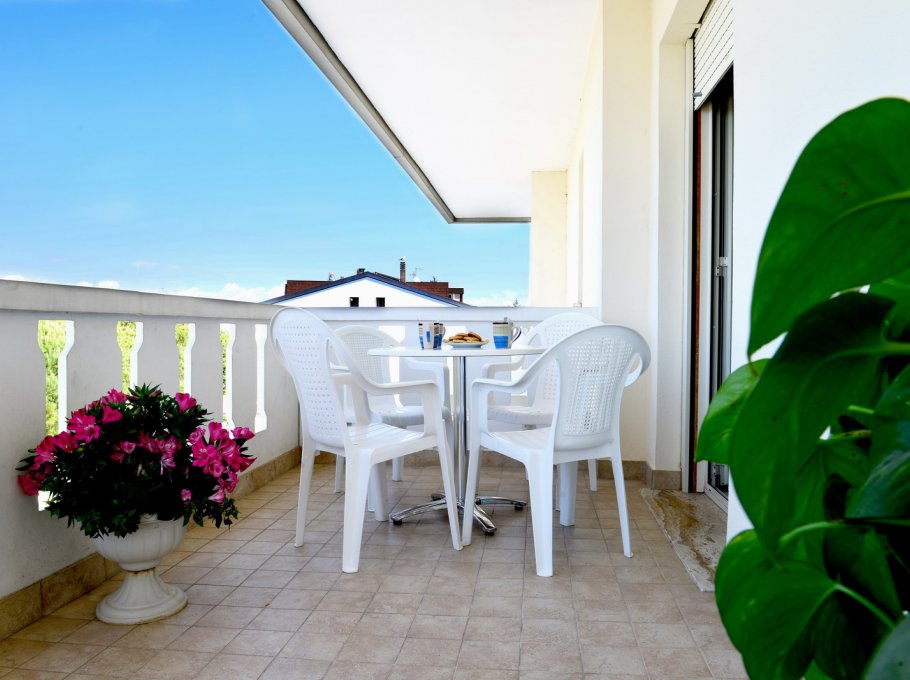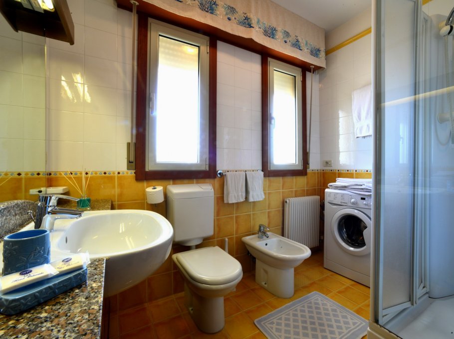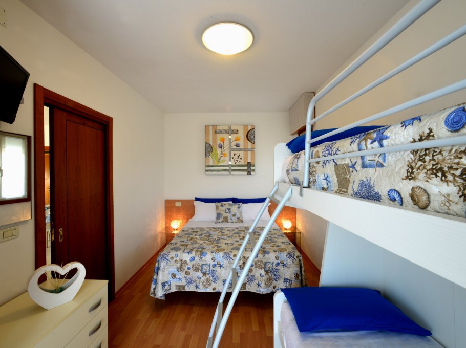 Type D - Made up of: living room with kitchenette, double bedroom + bunk beds, bathroom with shower (hydro-massage), big terrace (third floor with lift). Equipped with: Sat-Tv, washing machine, microwave, safe, air-conditioning/heating. Services included in the price: - weekly change of bed linen and towels; - cleaning of apartment on day of departure, taxes; -Wi-Fi, - beach material (1 beach-umbrella and 2 beach-beds) at beach office nr. 11 Lignano Sabbiadoro; - use of swimming pool and fitness room in Hotel Colorado in Lignano Pineta, - use of parking facilities (unattended); - use of bicycles; - Sunday evening aperitif in our hotel bar. - ON REQUEST IT IS POSSIBLE TO STAY LONGER OR SHORTER THAN 7 NIGHTS -
