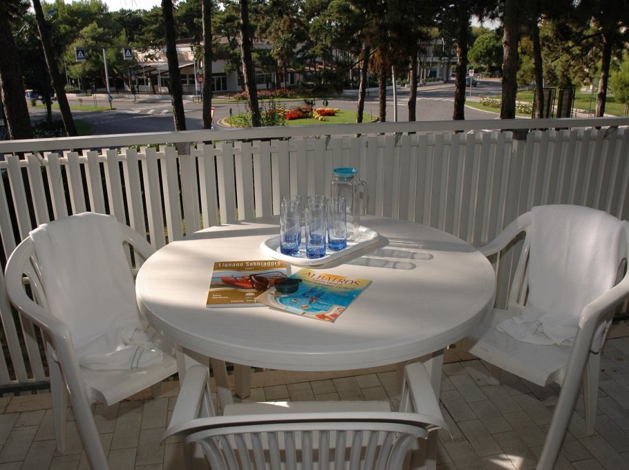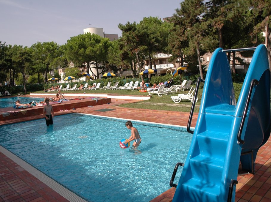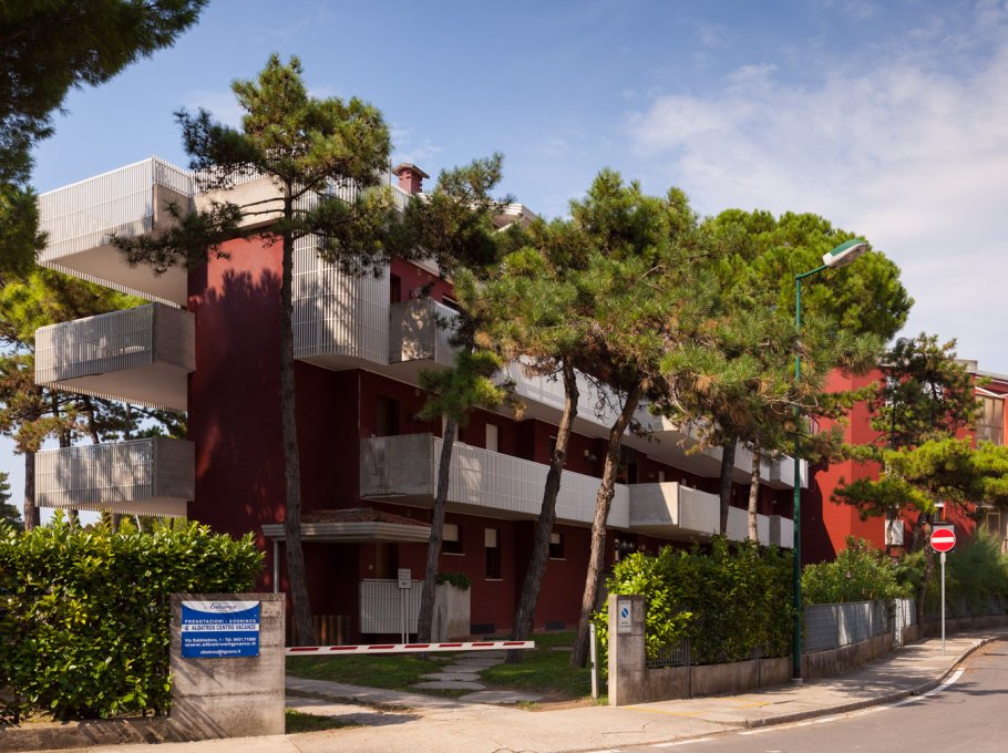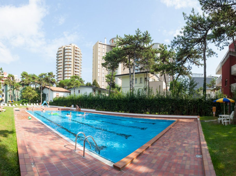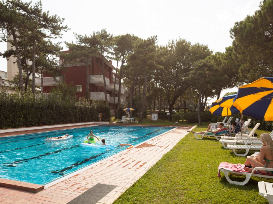 A small, modern two-story residence that rises in the middle of a green, pine wood-garden. It has a swimming pool for adults and one for children, playground, parking area, loundry room with washing machines and driers, working with coins. The residence is located at 150 metres from the sandy beach and not so far from the center of Lignano Sabbiadoro. Minimarkets, supermarkets and bakery are nerby. The apartmets are confortable and practical, with spacious rooms, bright and coloured furniture. All balconies are furnished with outdoor tables overlooking the garden.