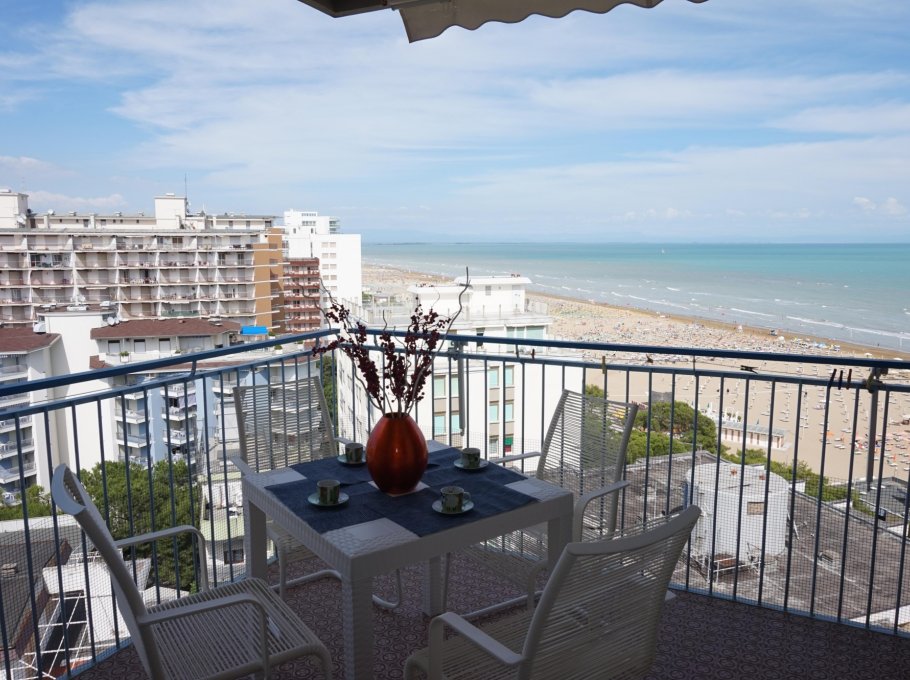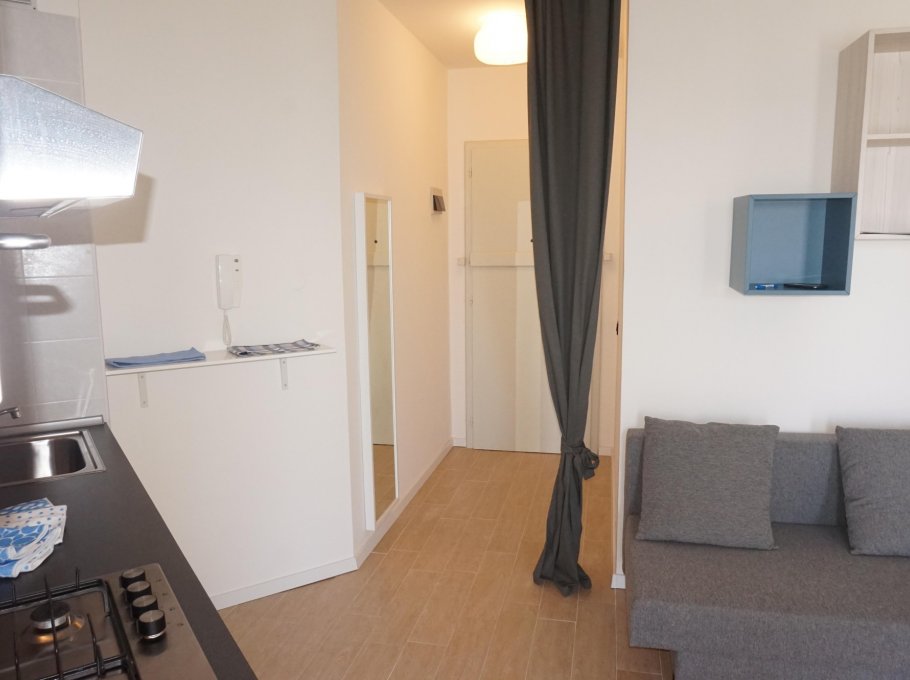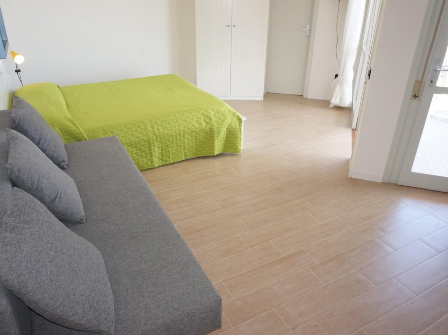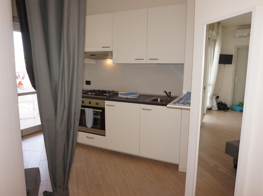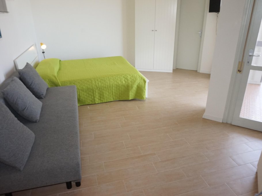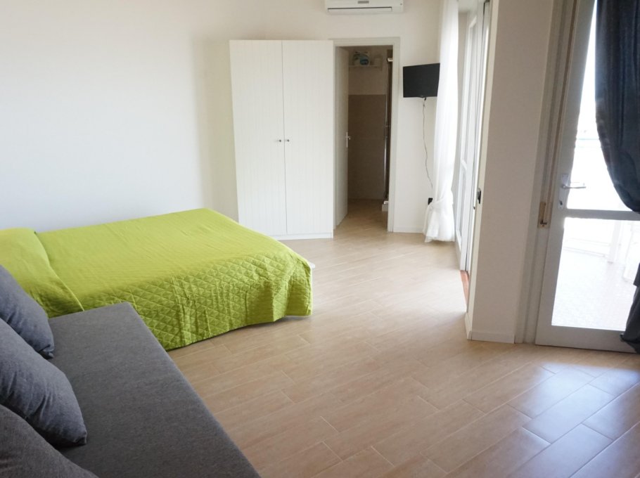 Nice studio apartment for up to 4 people, on the 12th floor, consisting of: living room with a fixed double bed and a sofa bed for one and a half, kitchenette with electric oven, low refrigerator, with small freezer compartment, renovated bathroom with shower, terrace with wonderful frontal sea view, equipped with table and chairs. The apartment is equipped with TV, air conditioning. Closed parking with electric barrier, not numbered, limited parking spaces.