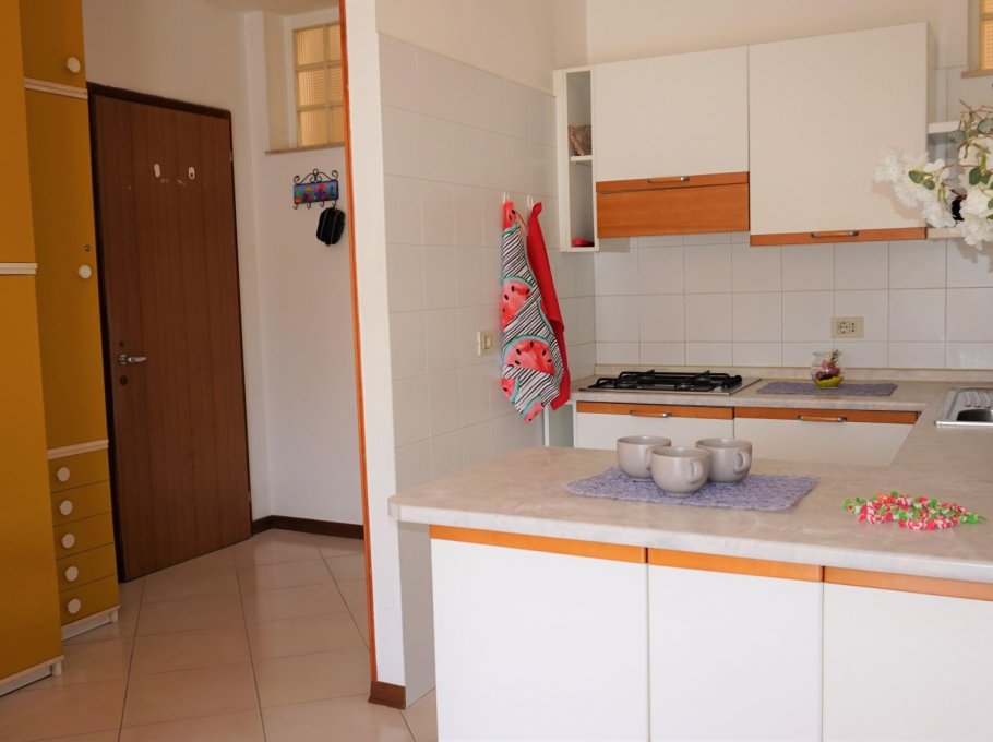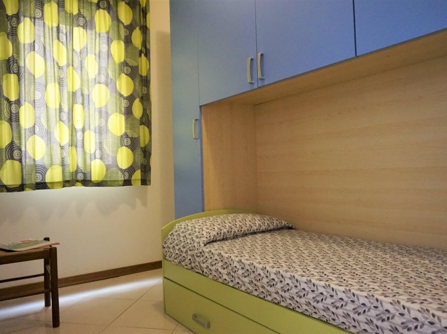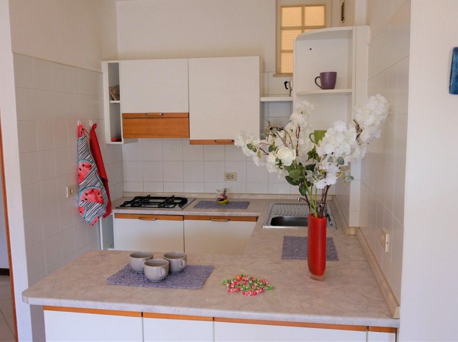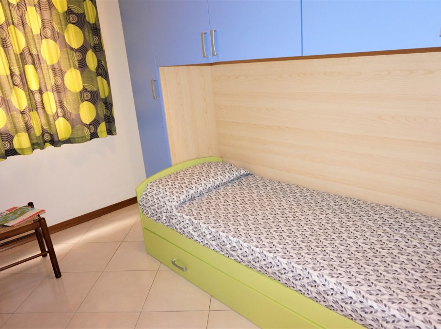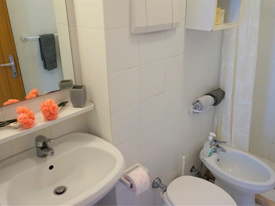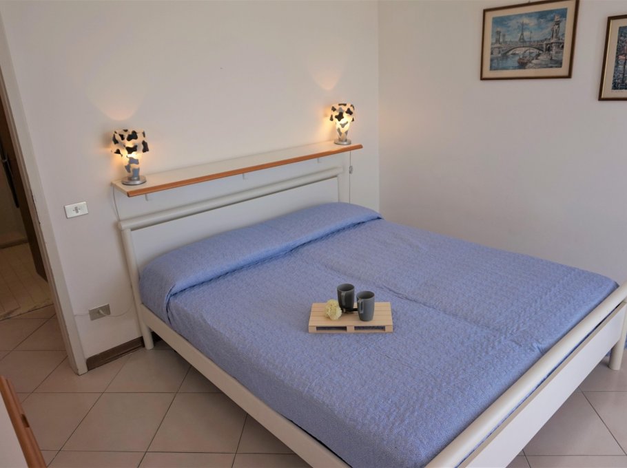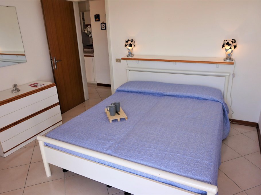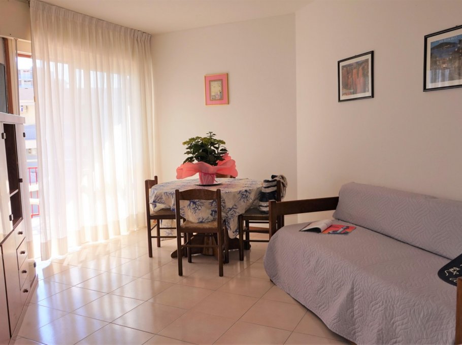 Bright apartment located on the 7th floor with side sea view (west), consisting of living room with kitchenette and single sofa bed, spacious terrace equipped with table and chairs, double bedroom, twin bedroom (single bed + pull-out bed), possibility addition of extra cot, bathroom with shower. Equipped with TV, large fridge with freezer, air conditioning with heat pump, parking bordered by an electric bar, limited number of parking spaces.